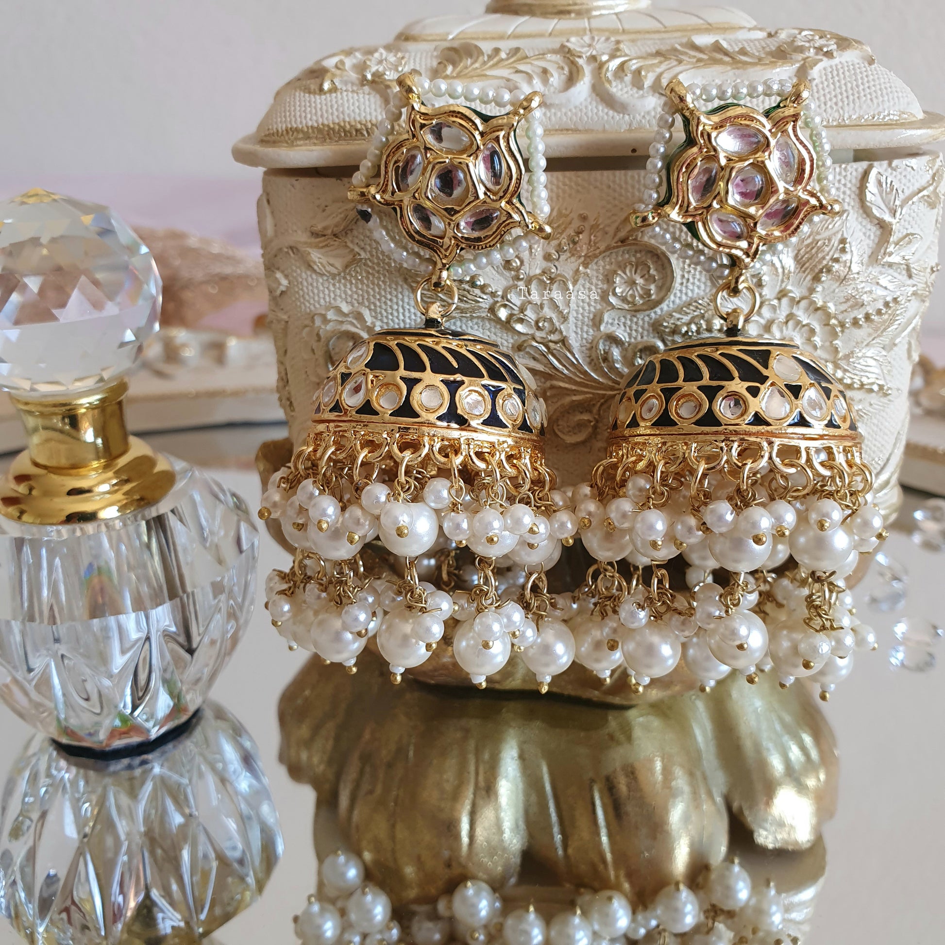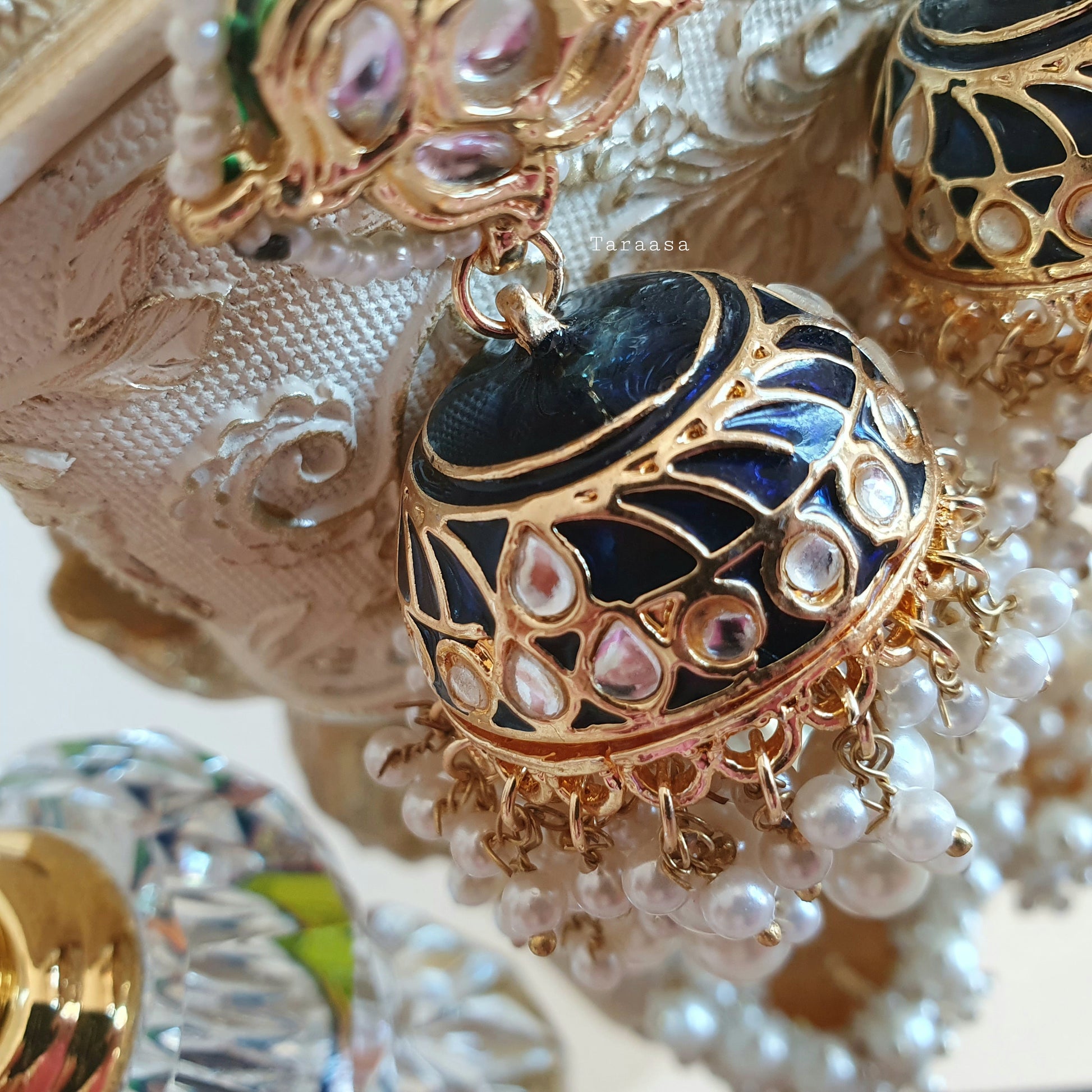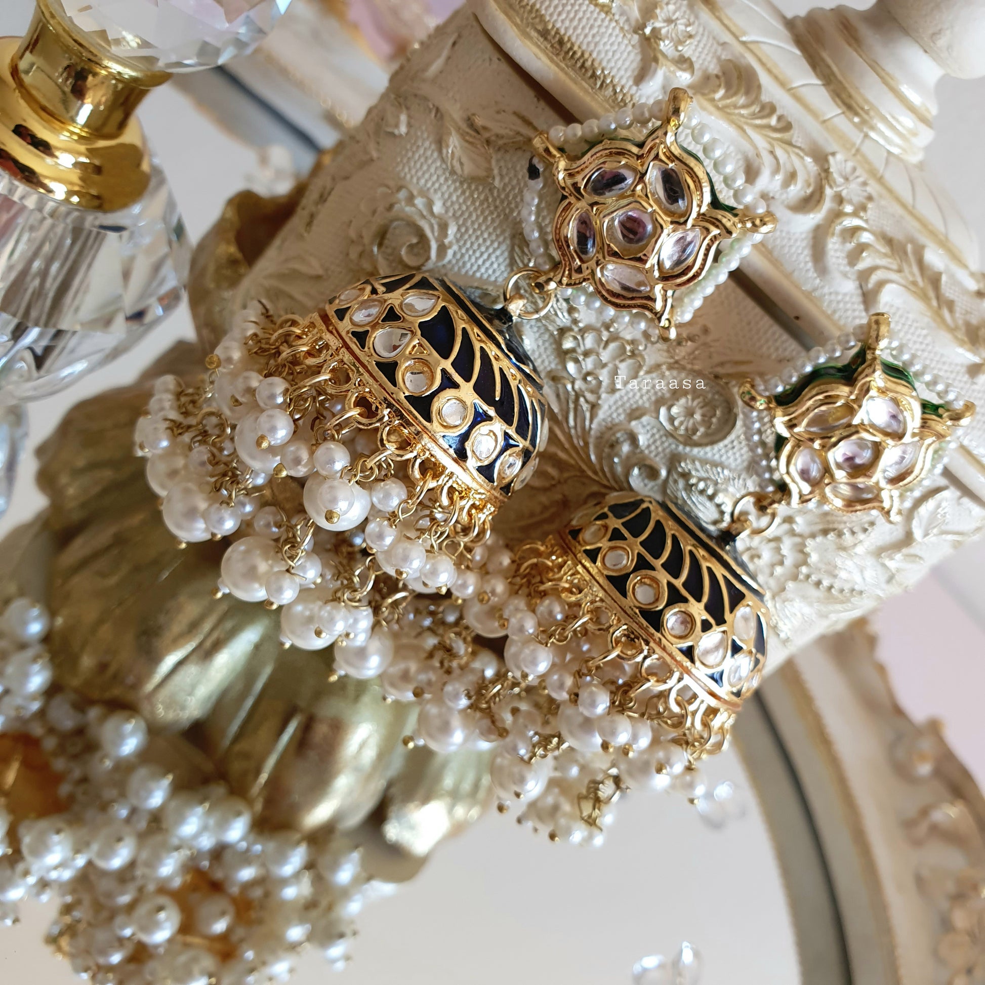 Our ornate jhumkis should be a staple in your jewellery collection! Handpainted navy meenakari set in rich gold and finished with not one but two rows of drops of pearls. These spectacular jhumkis will have all eyes on you!