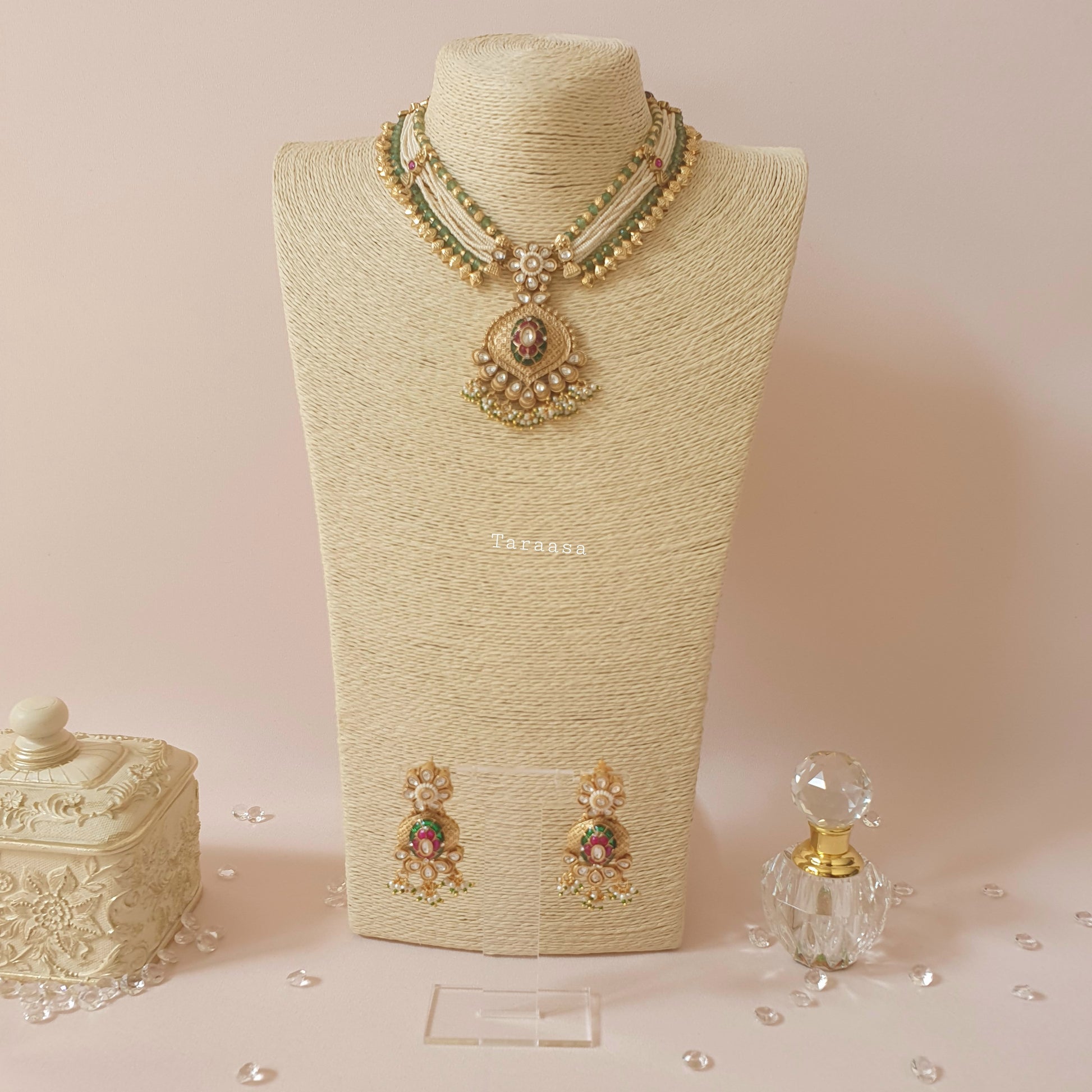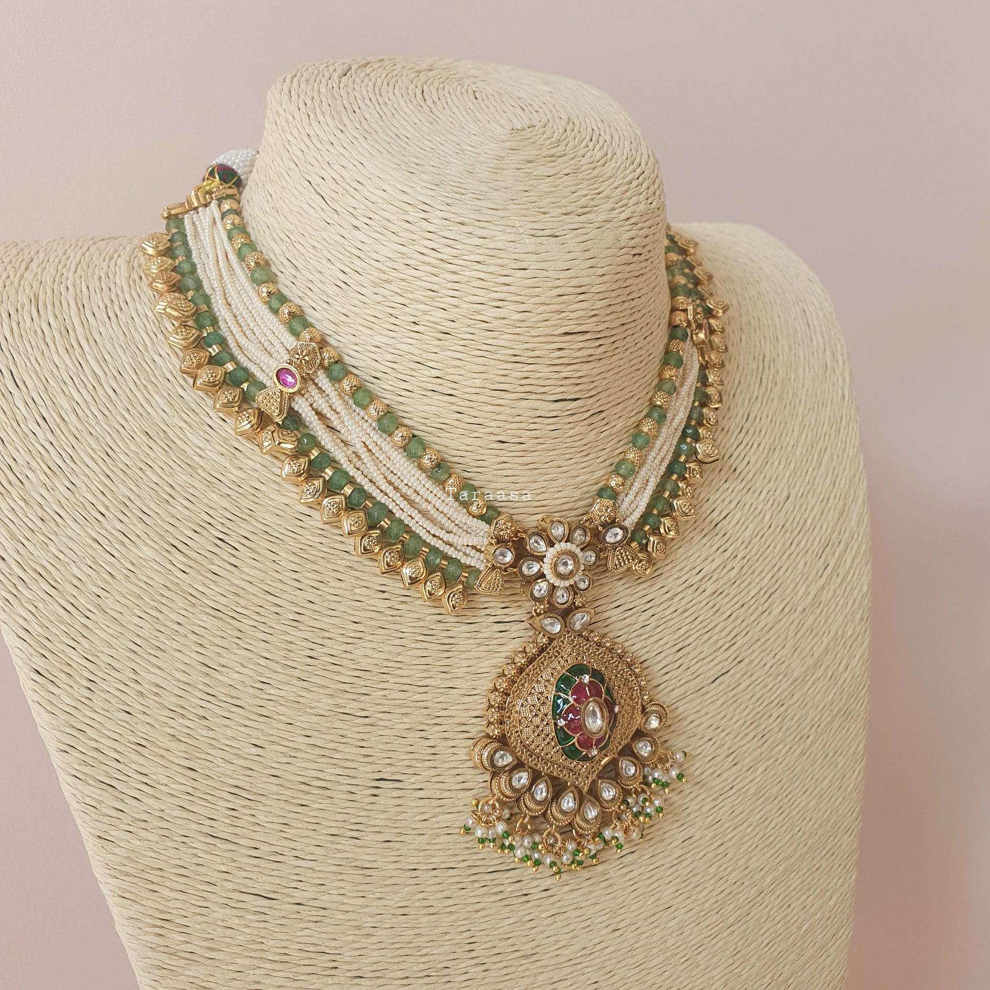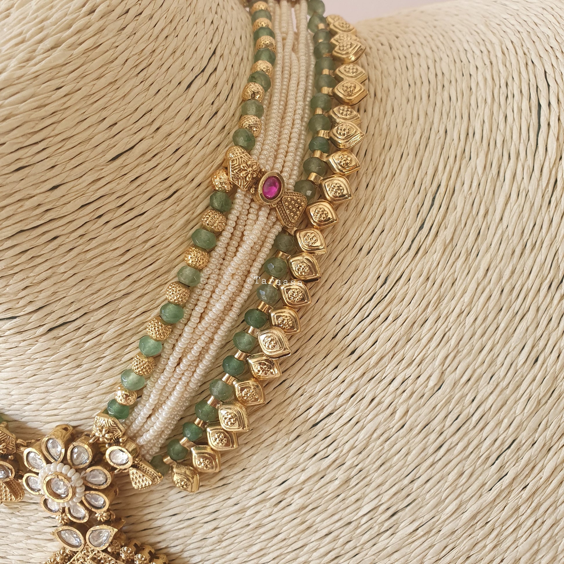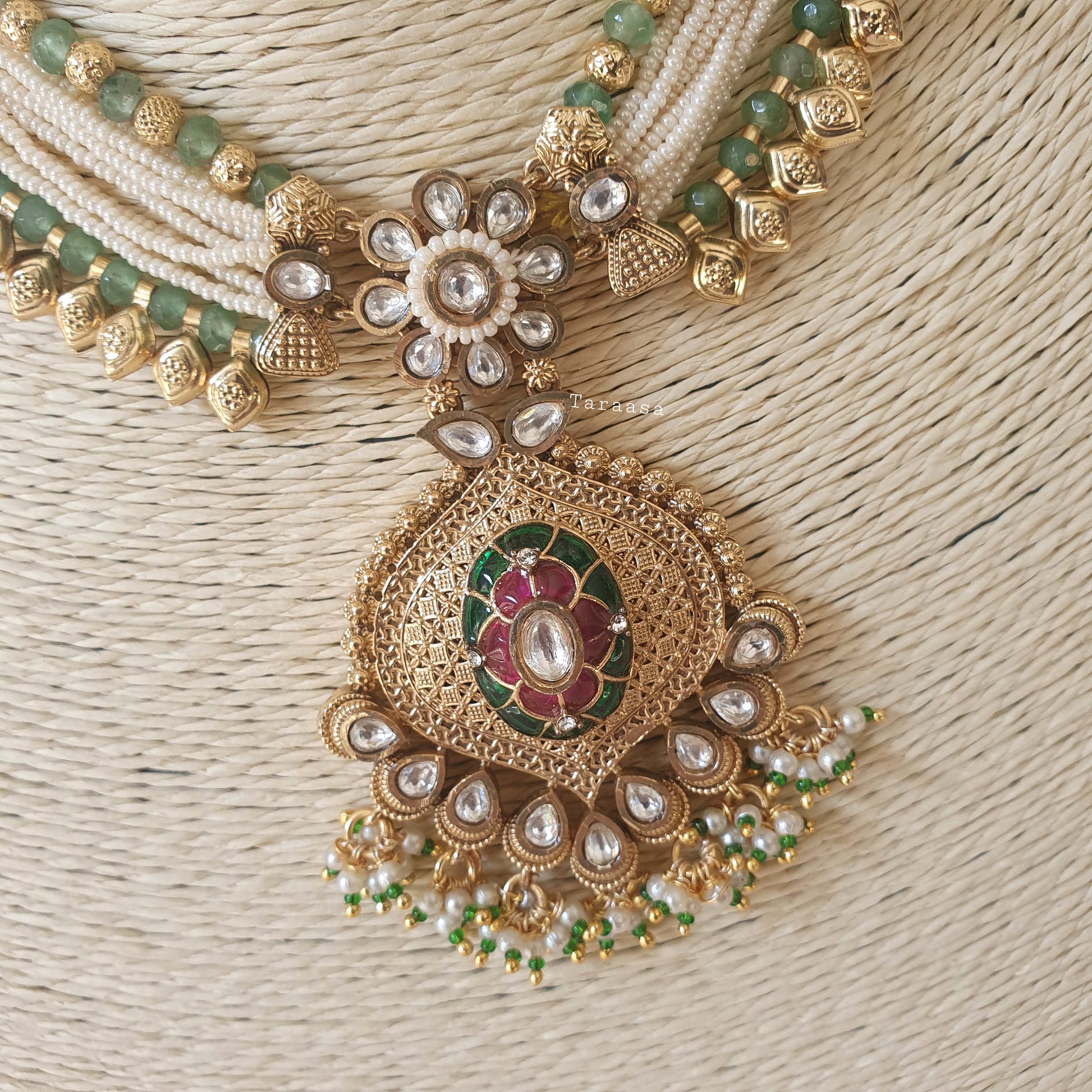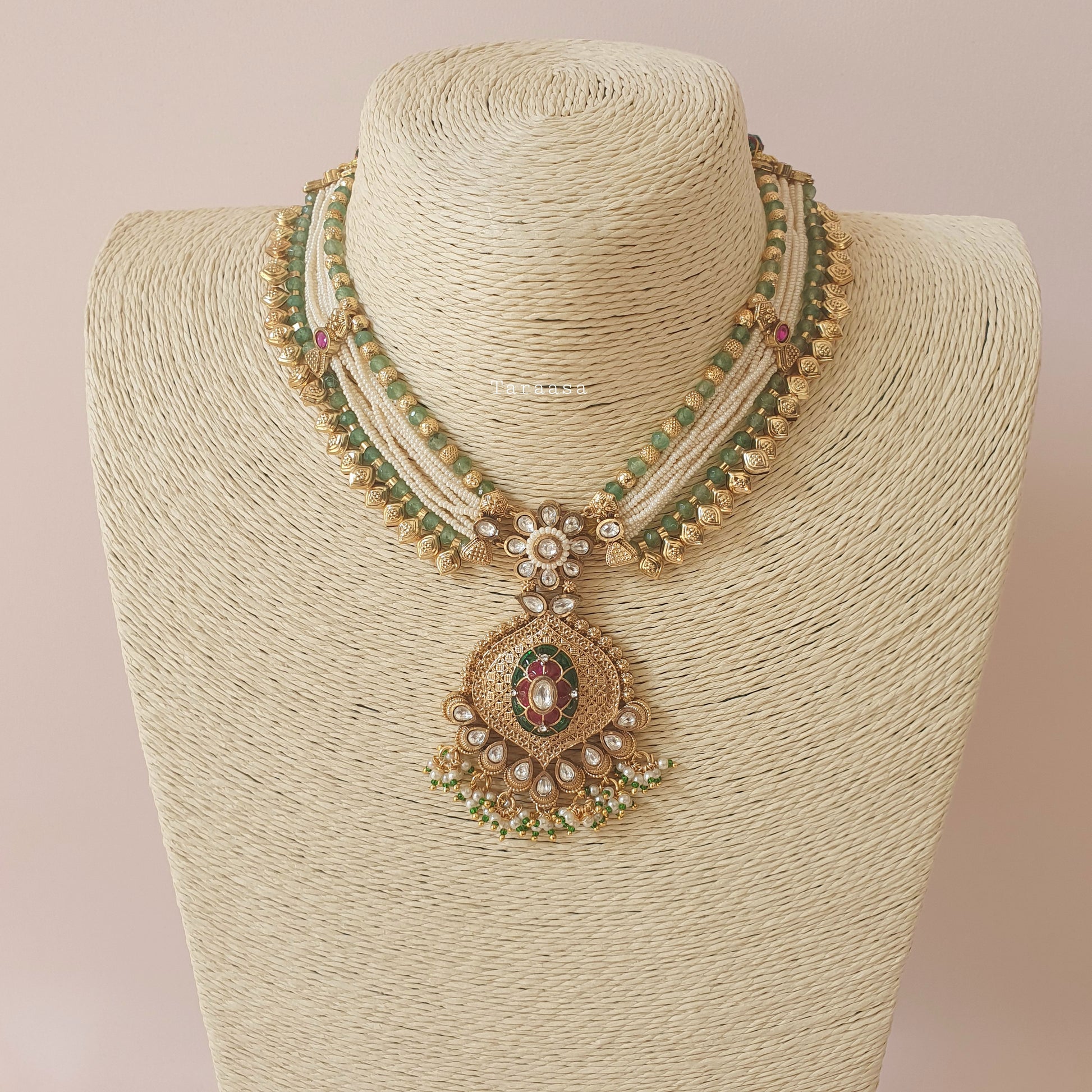Featuring a stunning gold pendant set with kundan and jadau kundan stones, embellished with dainty hanging pearls. Delicate green and gold beaded side chains add a touch of vintage charm, perfect for weddings and grand celebrations, where every detail whispers grandeur.