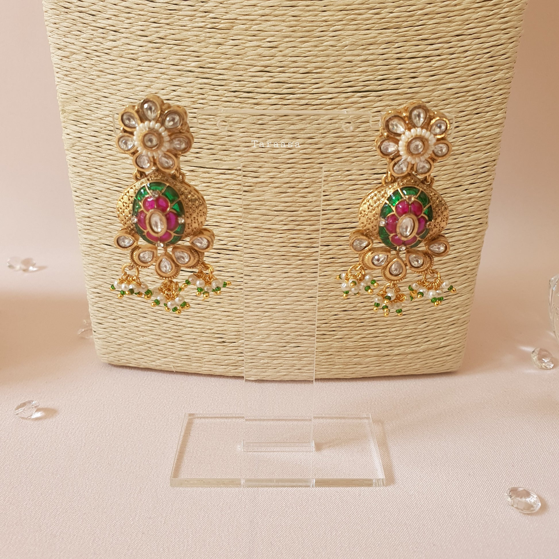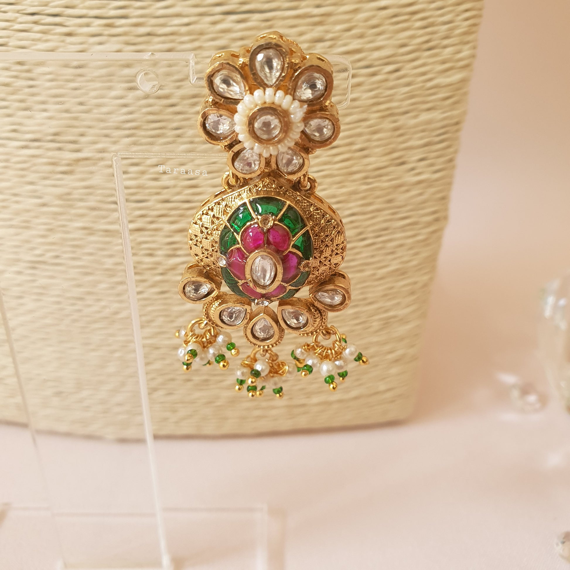 Like a perfect pair, these earrings dance in harmony with your choker—gold, jadau kundan, and pearls entwined in a legacy of craftsmanship
