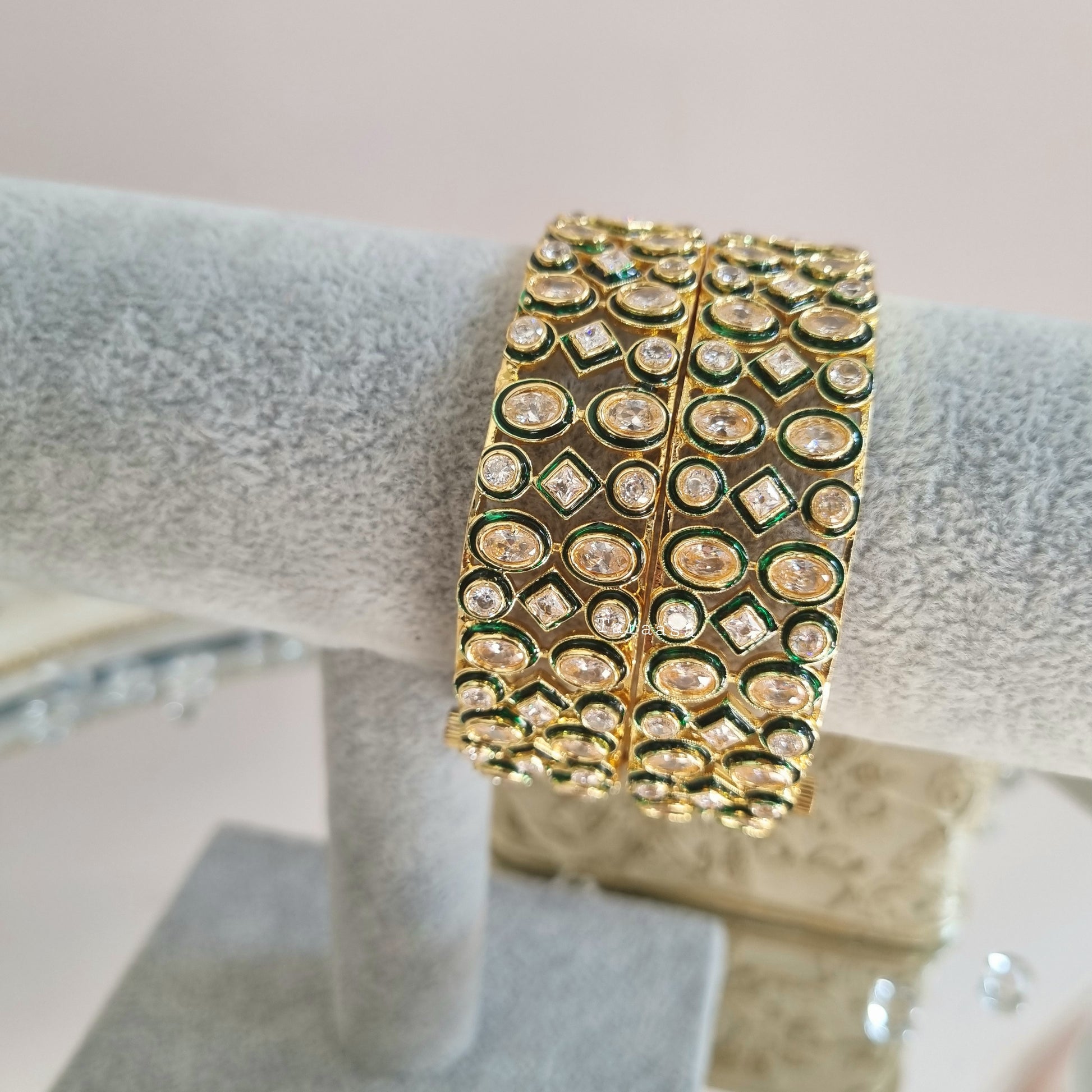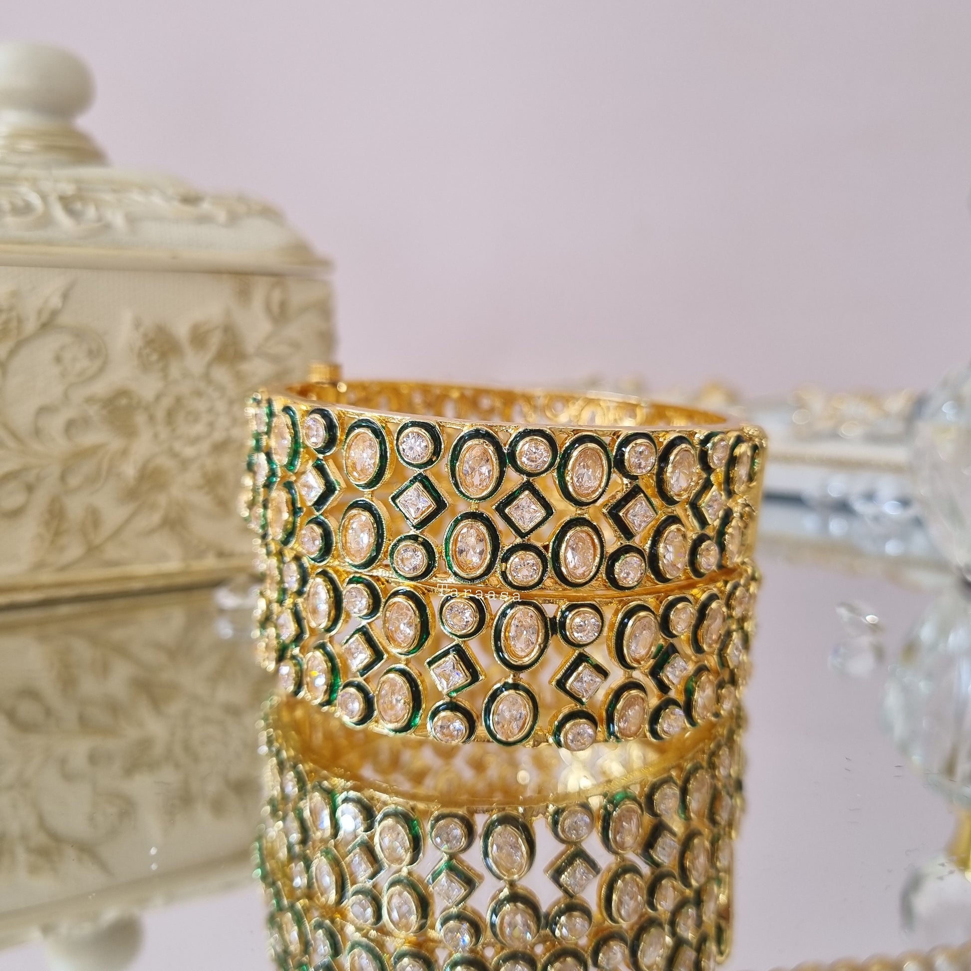 Drenched in splendor, these gold Kundan bangles are a serenade to royalty. Each stone stone gleams and is framed by delicate green edging that whispers elegance and royalty. A timeless ode to opulence, where heritage and elegance entwine.