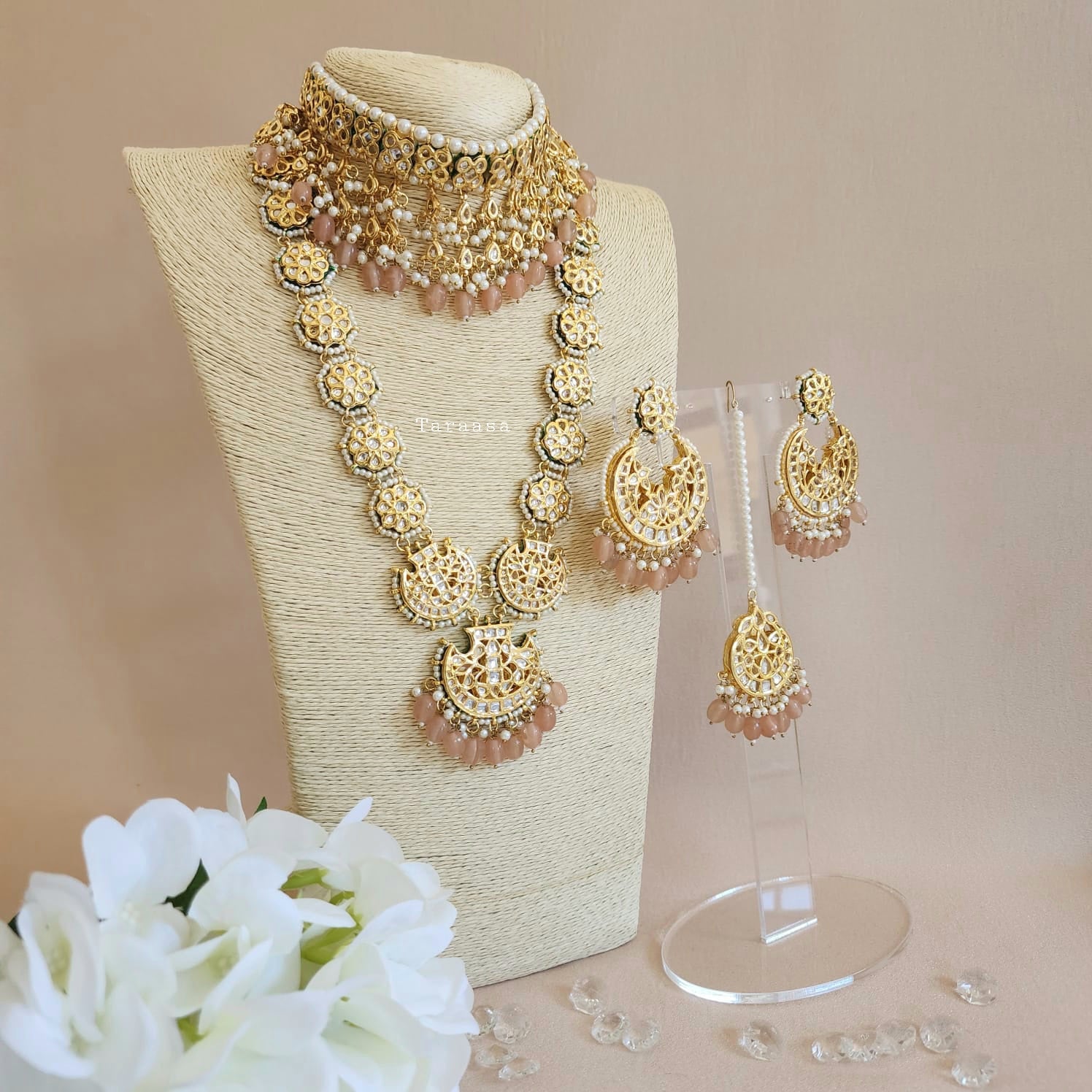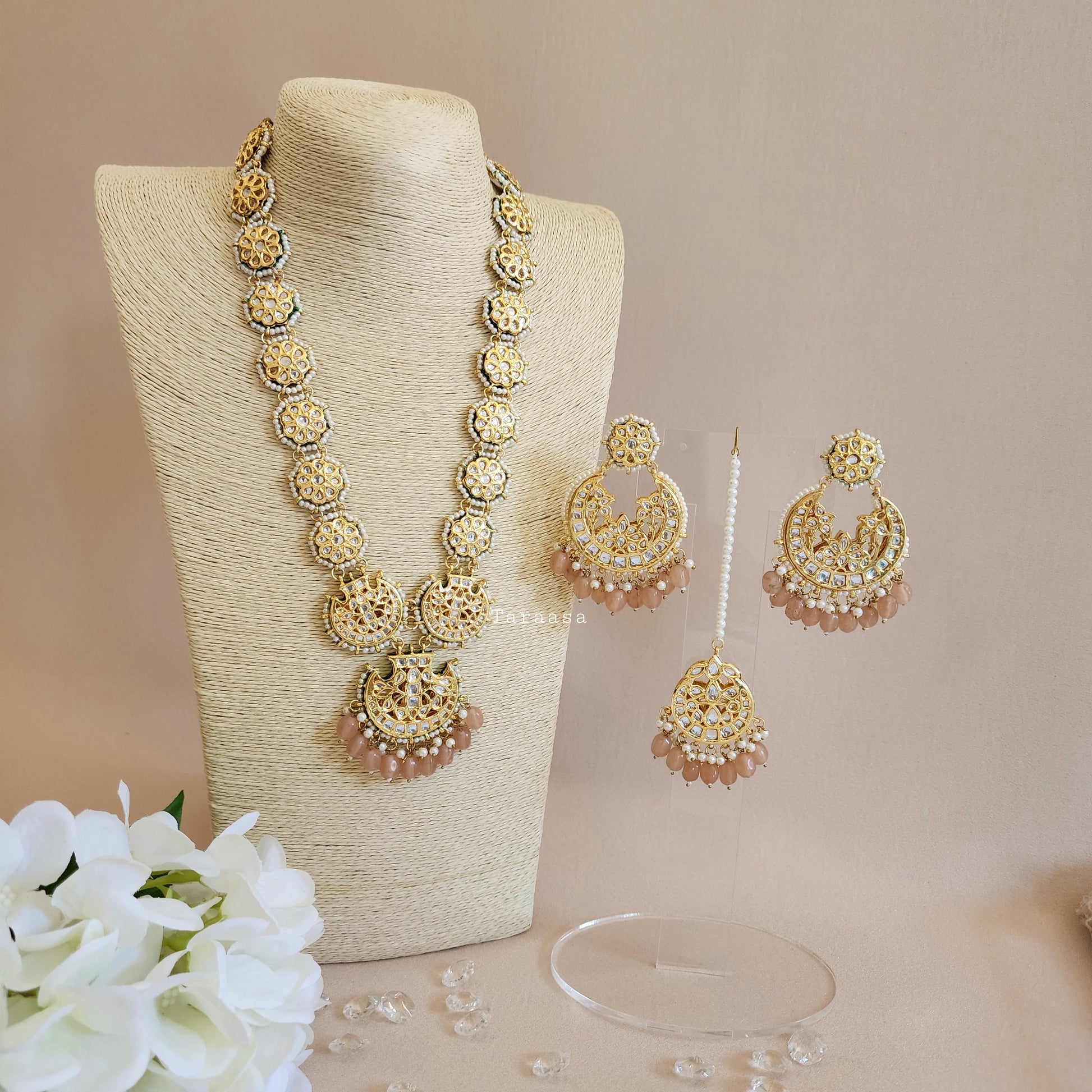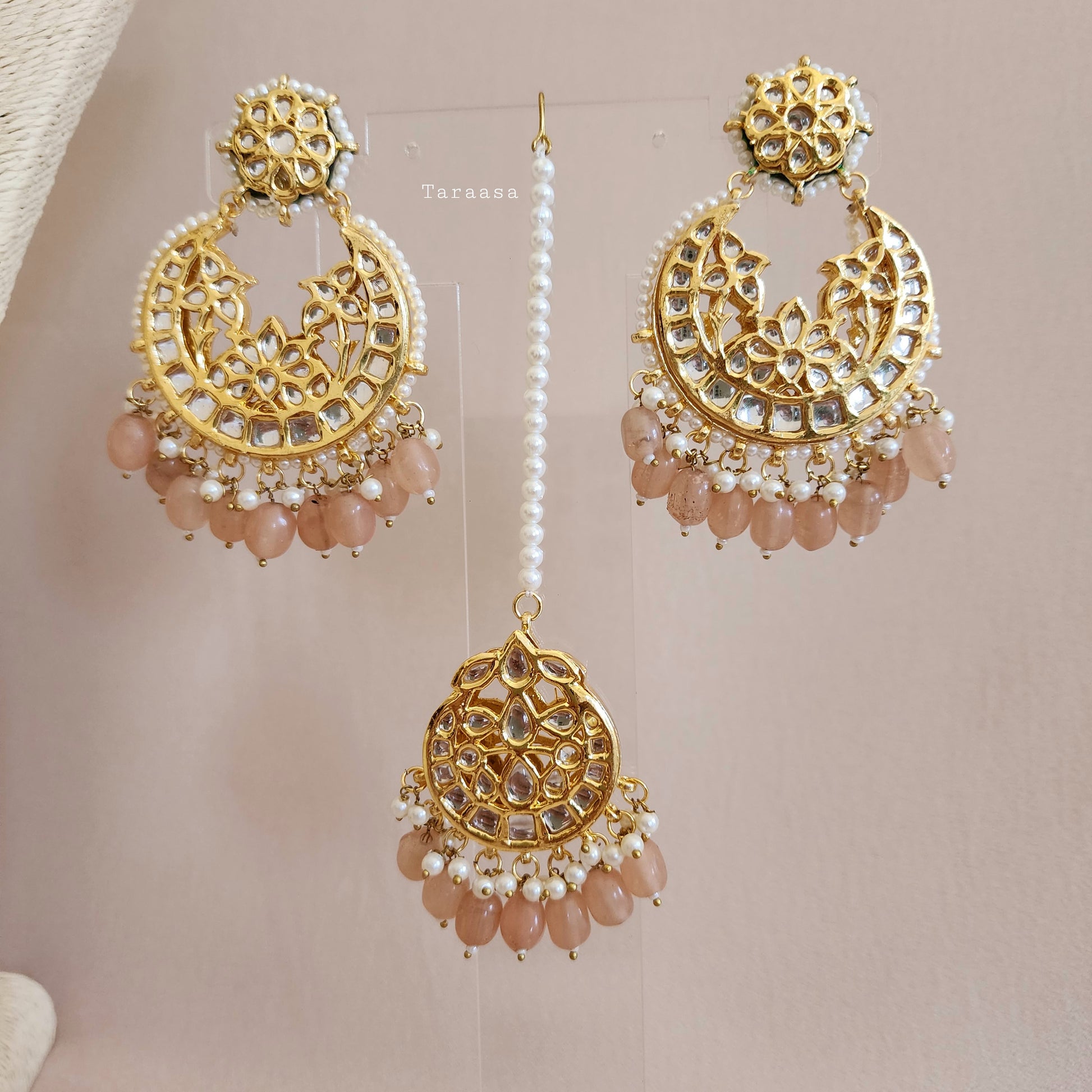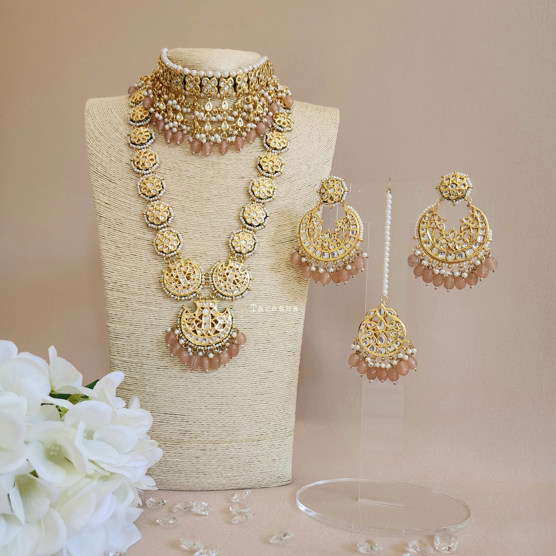 Set in a rich gold and finished with peach beads and a touch of pearls, this kundan bridal set is traditional and glamorous.