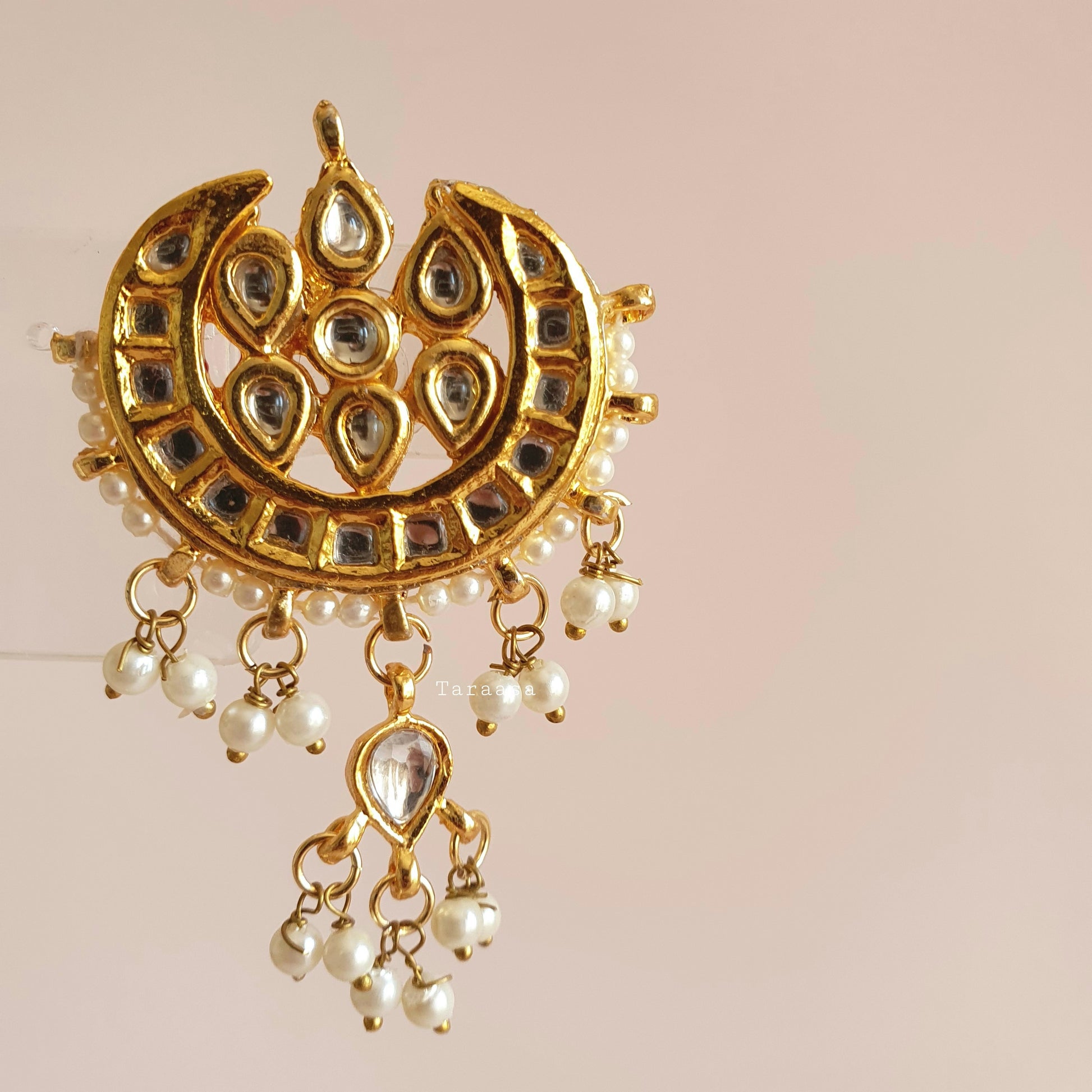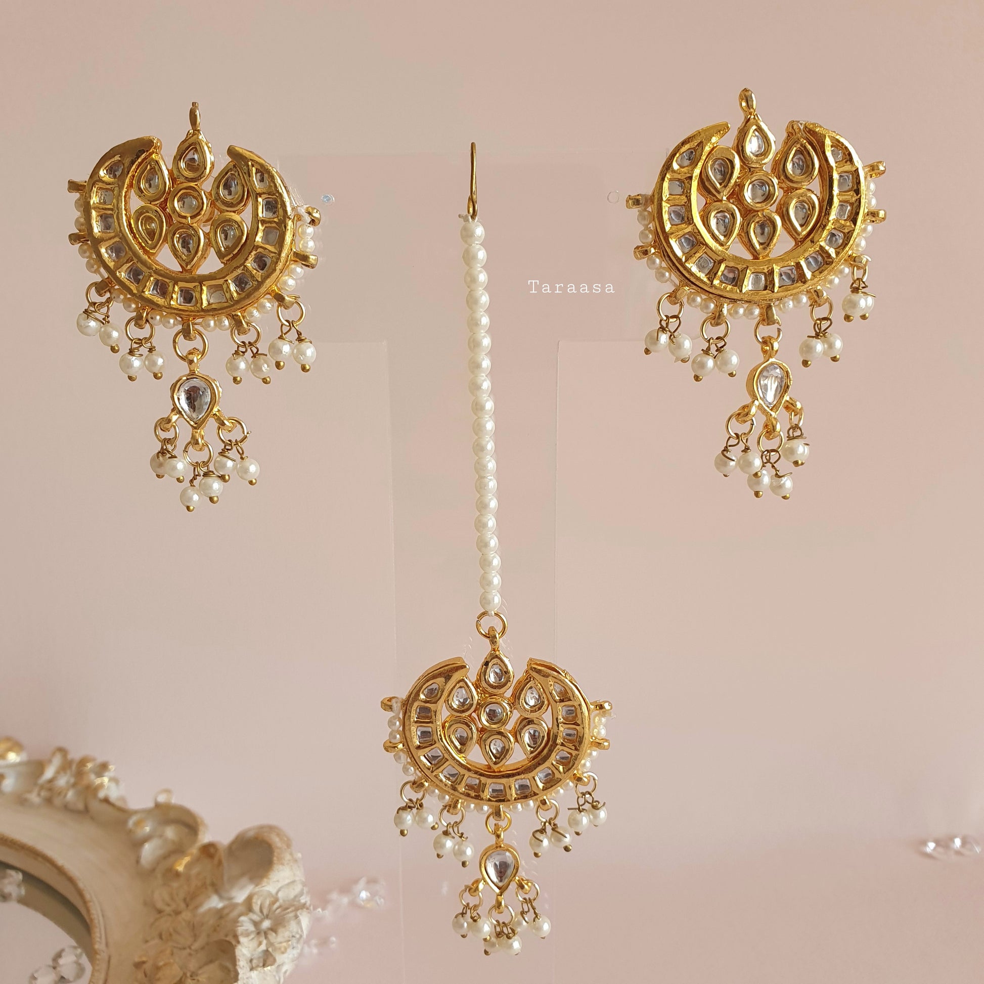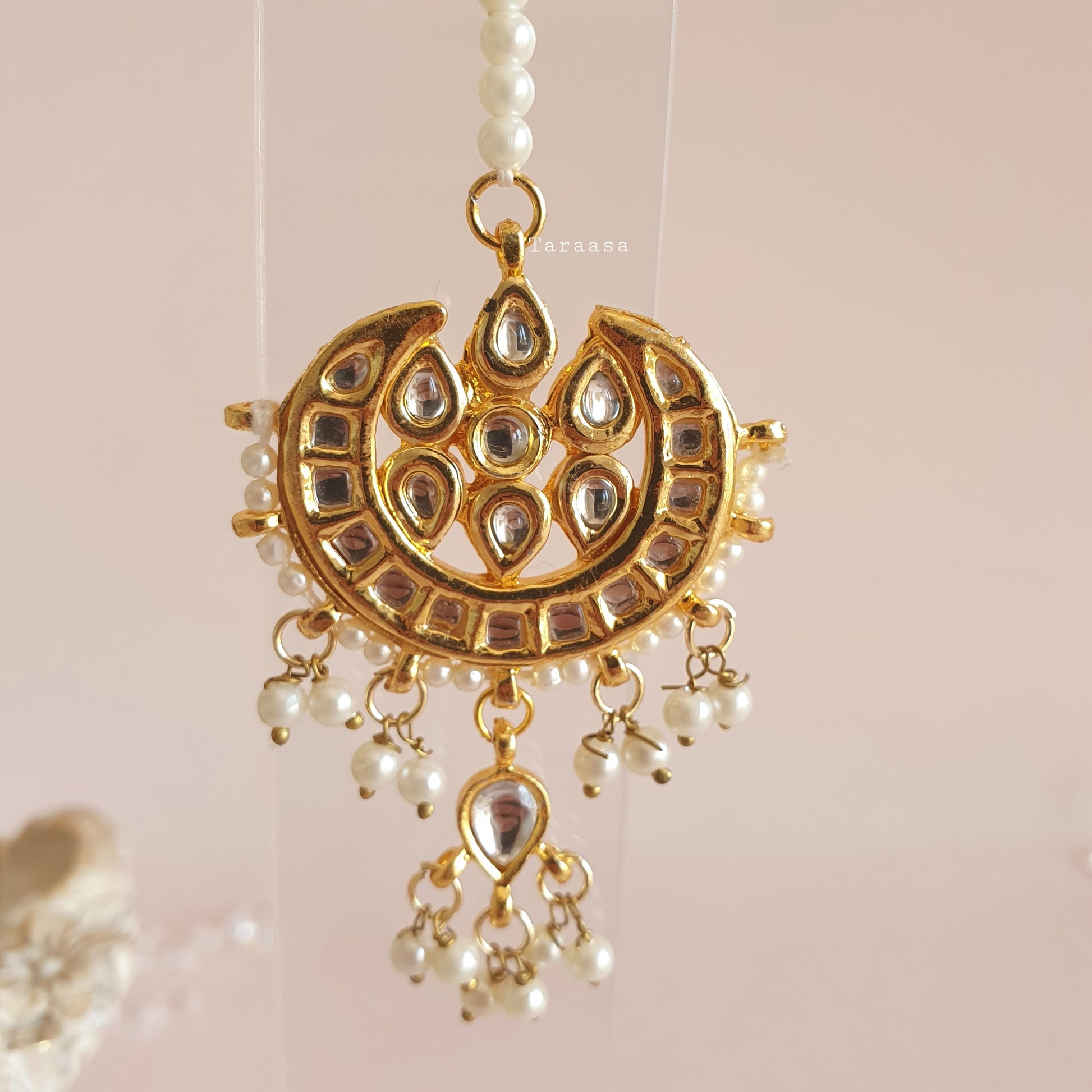 Our kundan choker set is a contemporary translation of kundan jewellery. The ropes of pearls meet crystals wrapped in brilliant gold and are finished with drops of pearls.