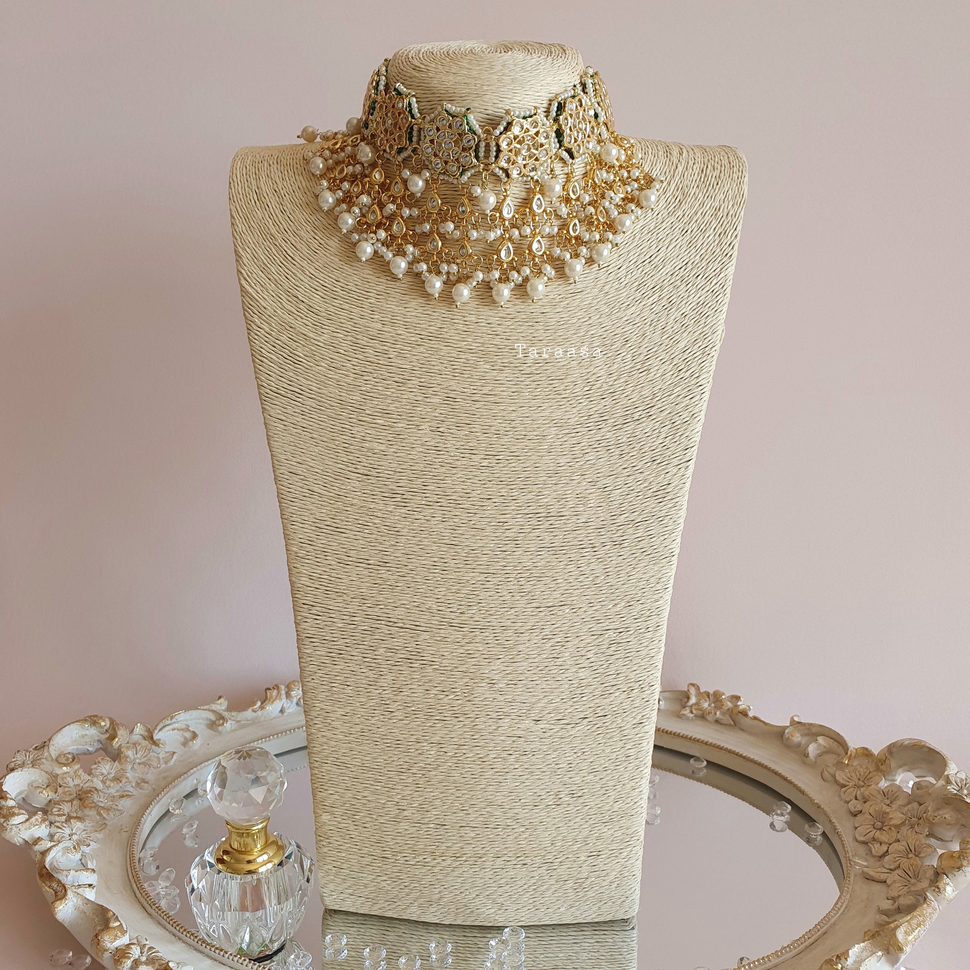 Set in a rich gold of quality floral kundan bordered with tiny pearls and carefully handstrung in pretty clusters of pearls, this kundan bridal set is traditional and glamorous.
