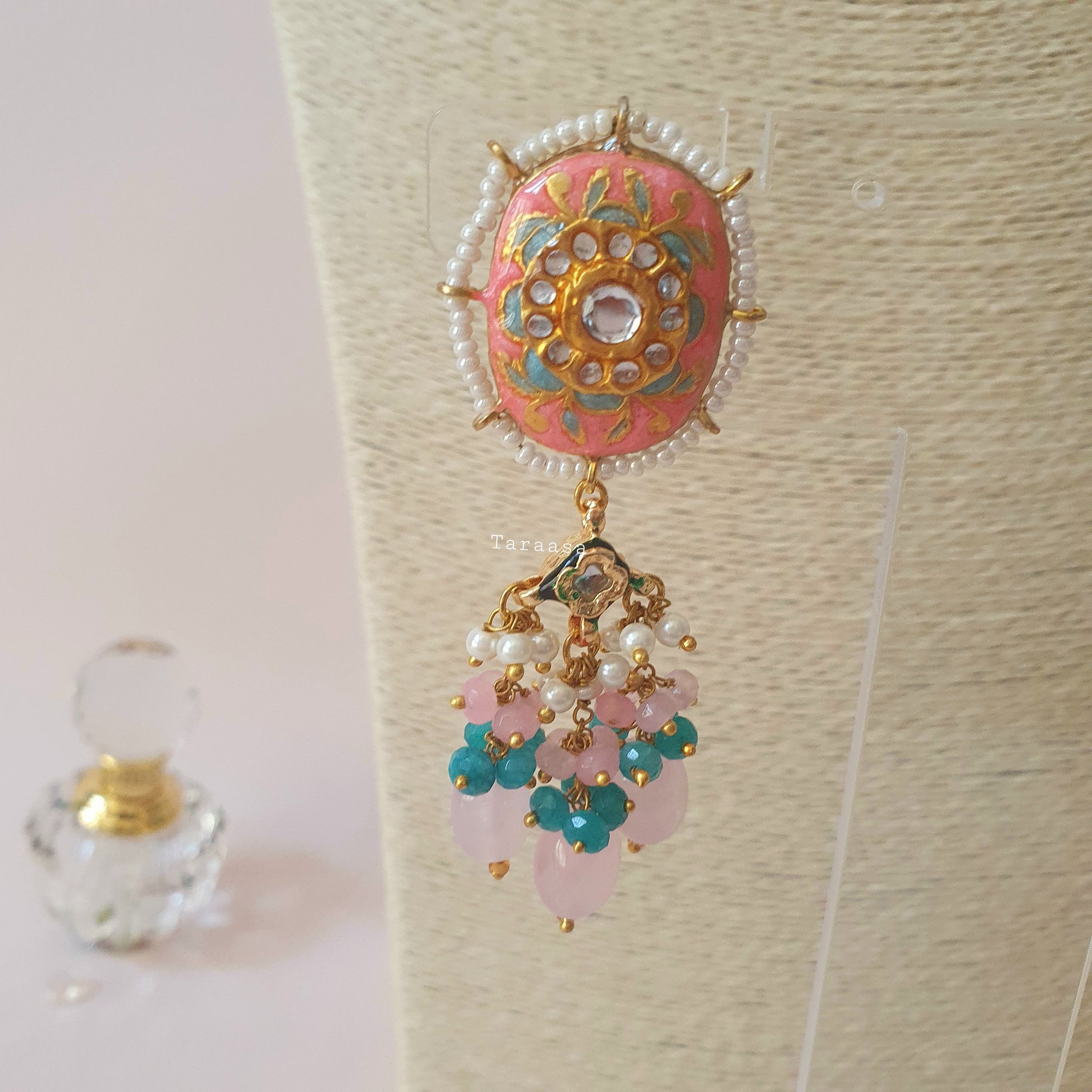 The matching drop earrings mirror the same artistry, bringing together pearls, pink and blue crystal beads, and kundan accents for a graceful, cohesive finish.