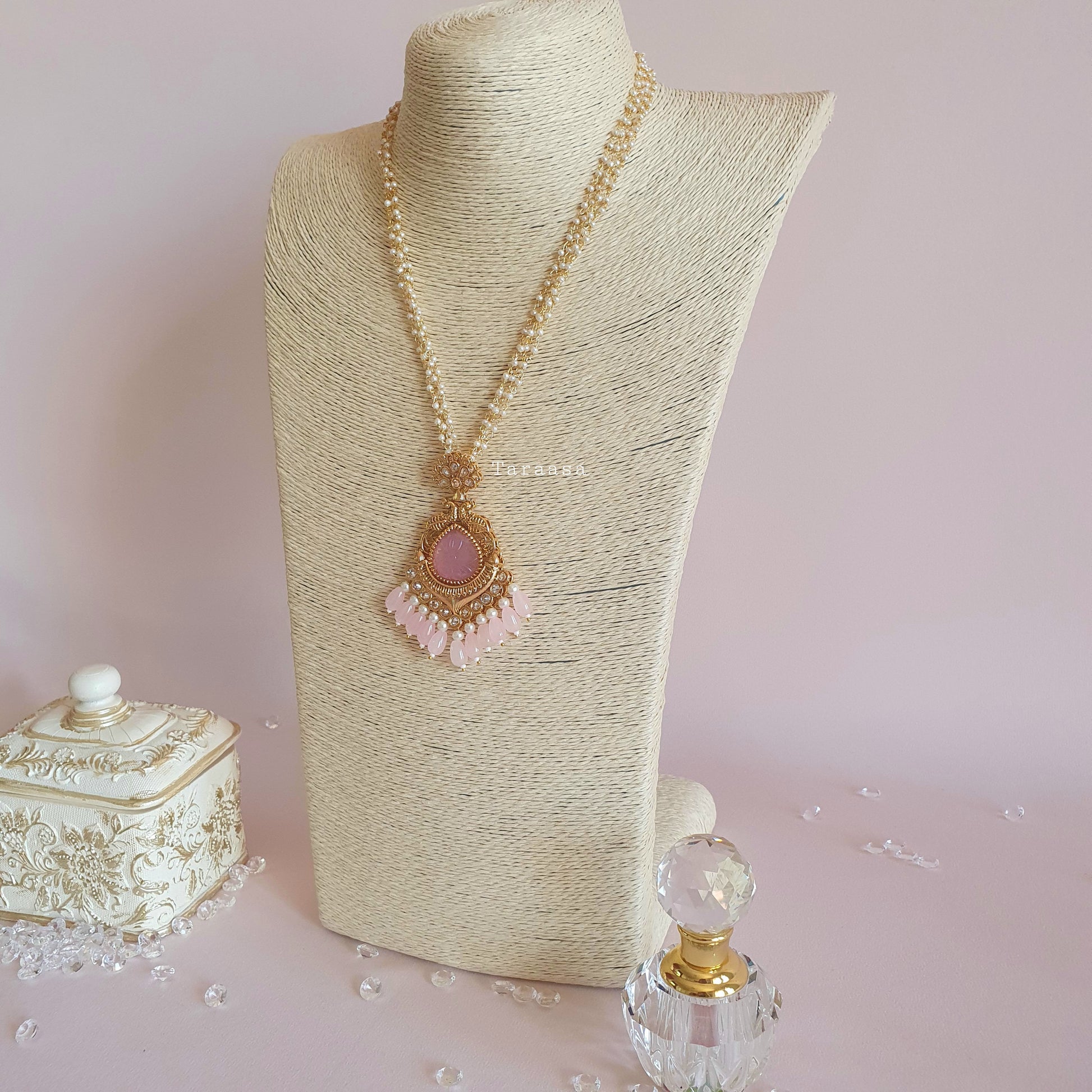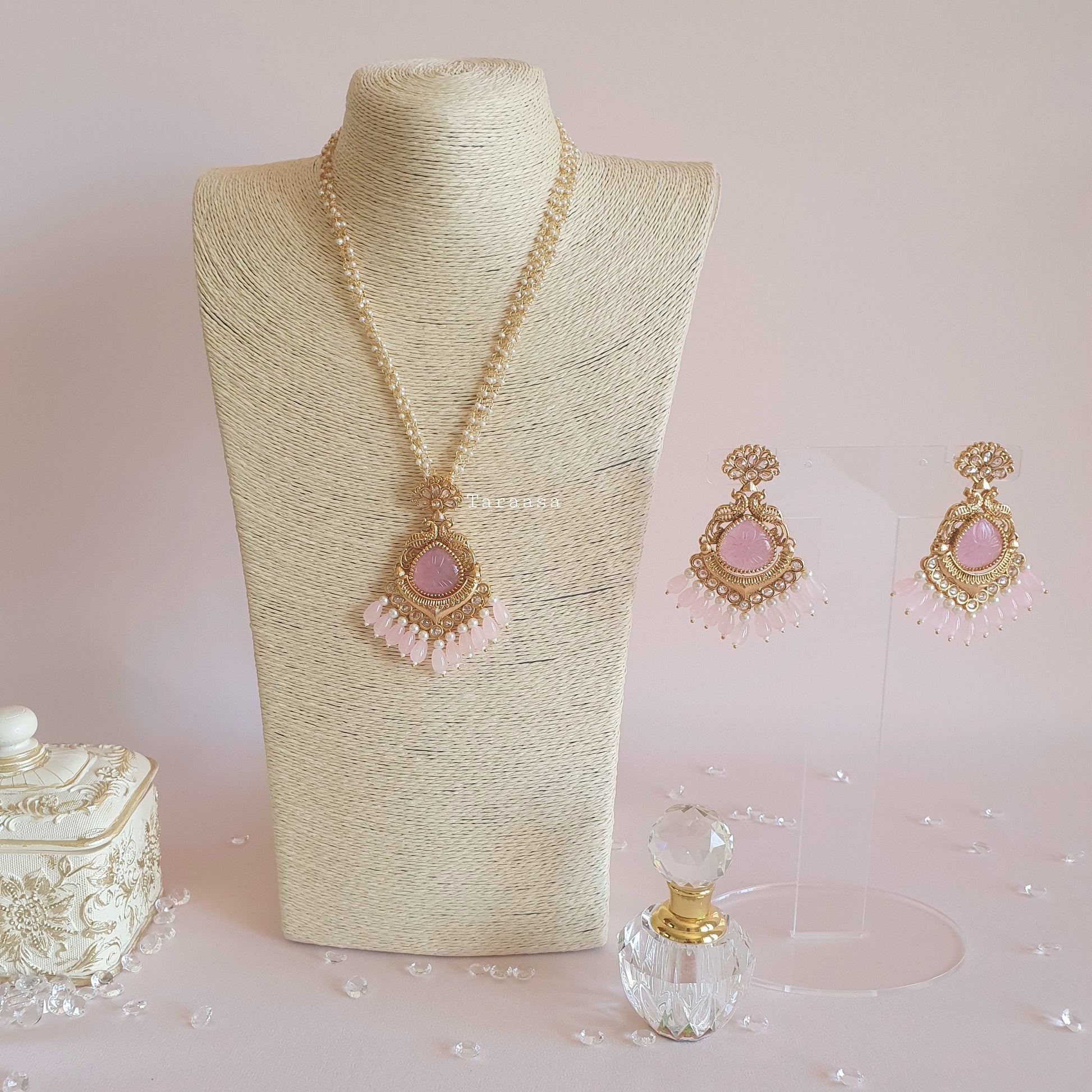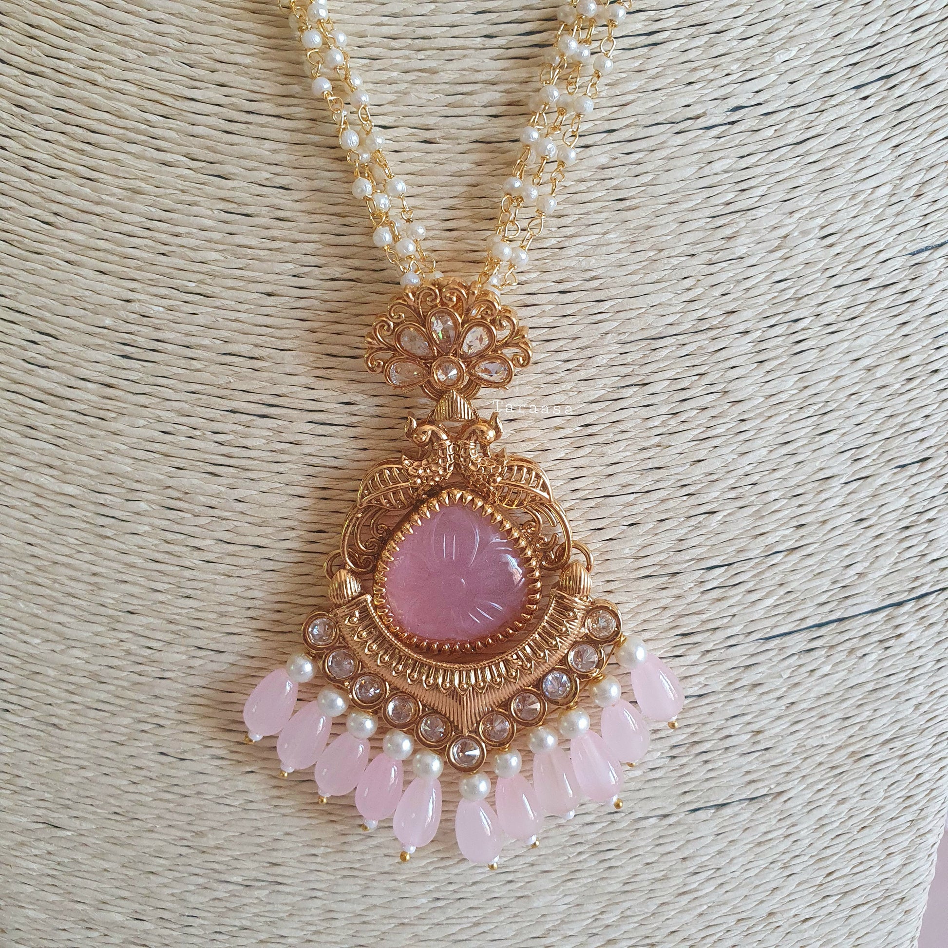 This elegant necklace set is strung together with dainty pearls that meet a misty rose colour, glass monalisa pendant encapsulated by peacocks, surrounded by gleaming stones, pearls, drops of light pink beads and finished in gold. The earrings are equally beautiful and are the perfect finishing touch to this versatile set.