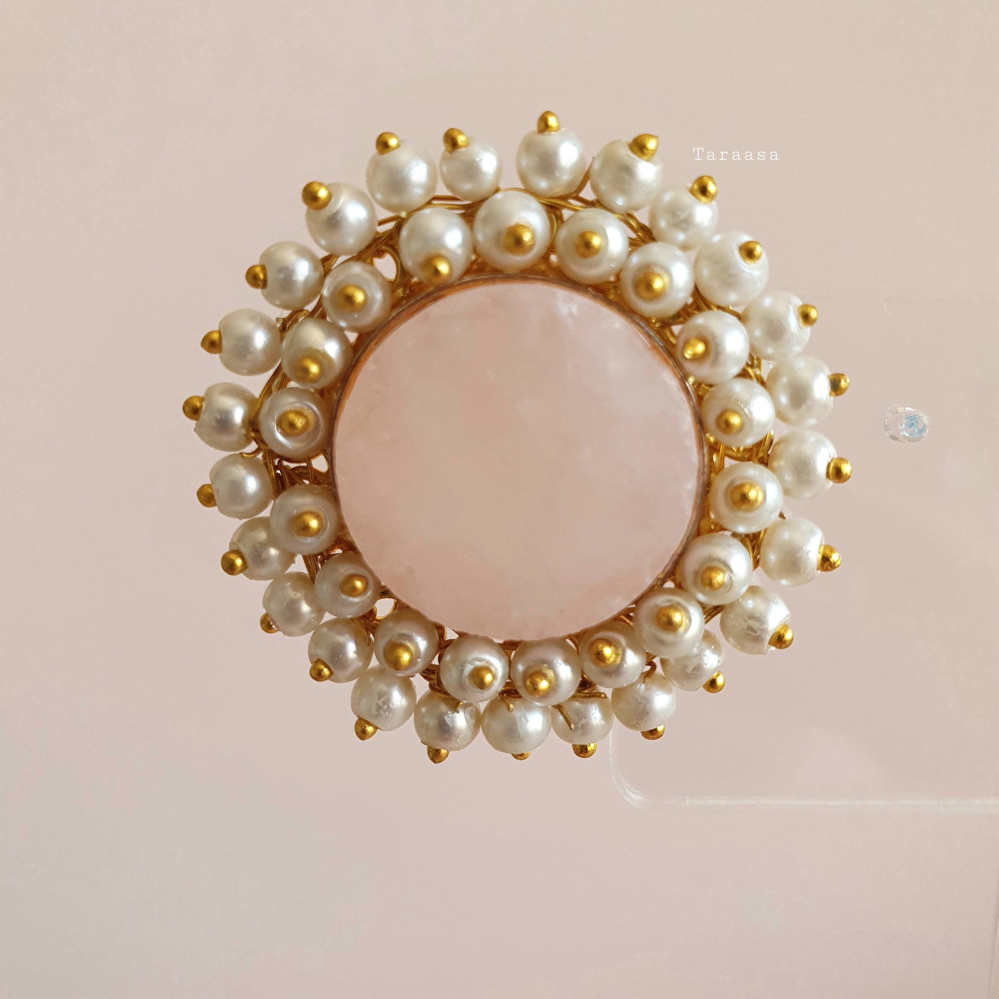 Beautiful crystal quartz stones in a subtle Rose pink colour are surrounded by elegant, tiny pearls and set in luxe gold.