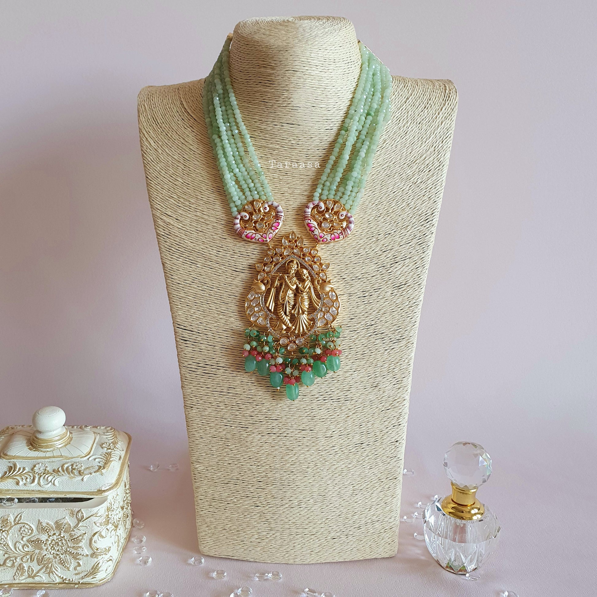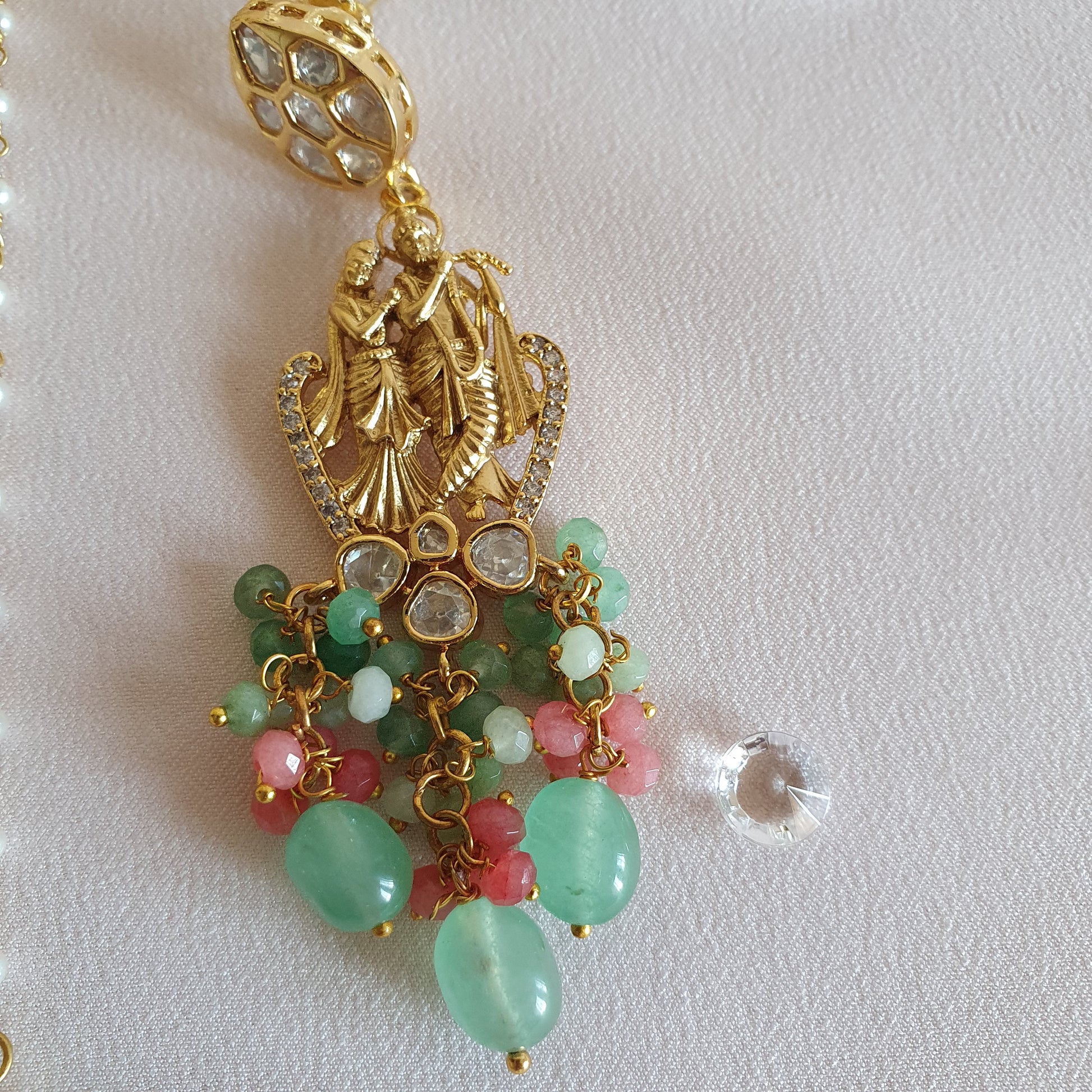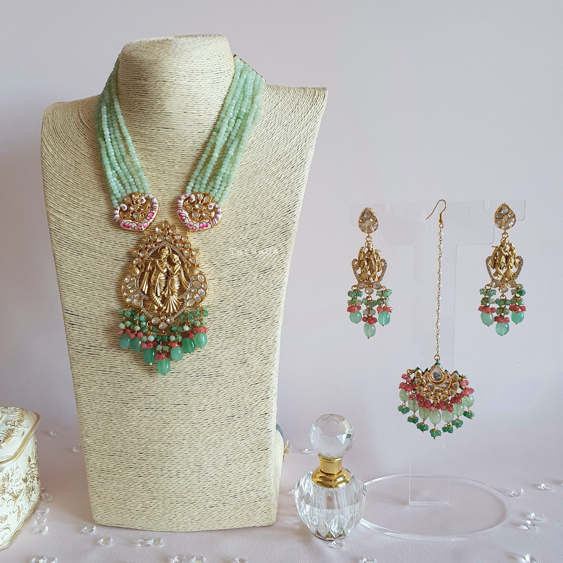 Transcending eras, our signature Radha Krishna set is carved in a luxurious matte gold, engulfed with sparkling kundan stones and diamantes. Ropes of gorgeous mint colored beads join the pendant with painted pink peacocks. Drops of mint and pink beads add a whimsical final touch. It's simply breathtaking!