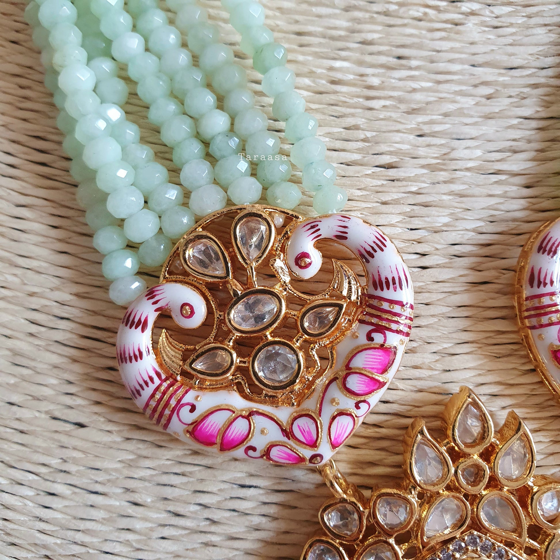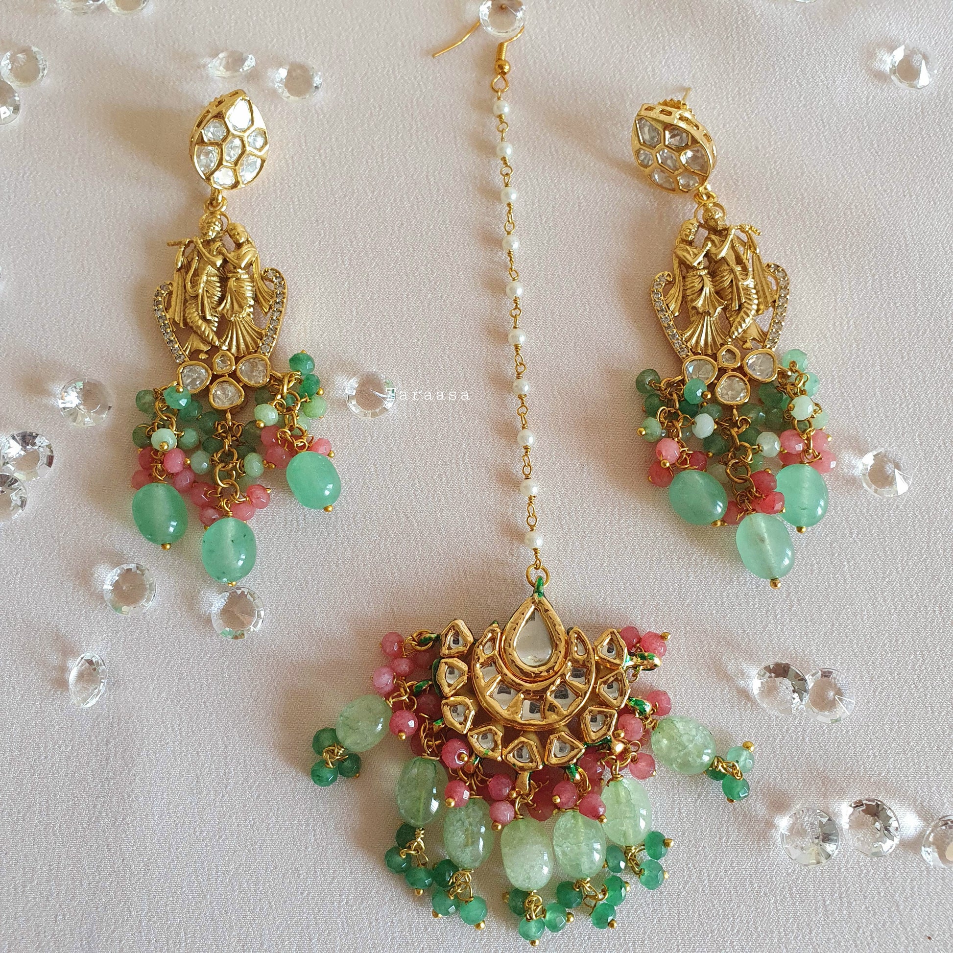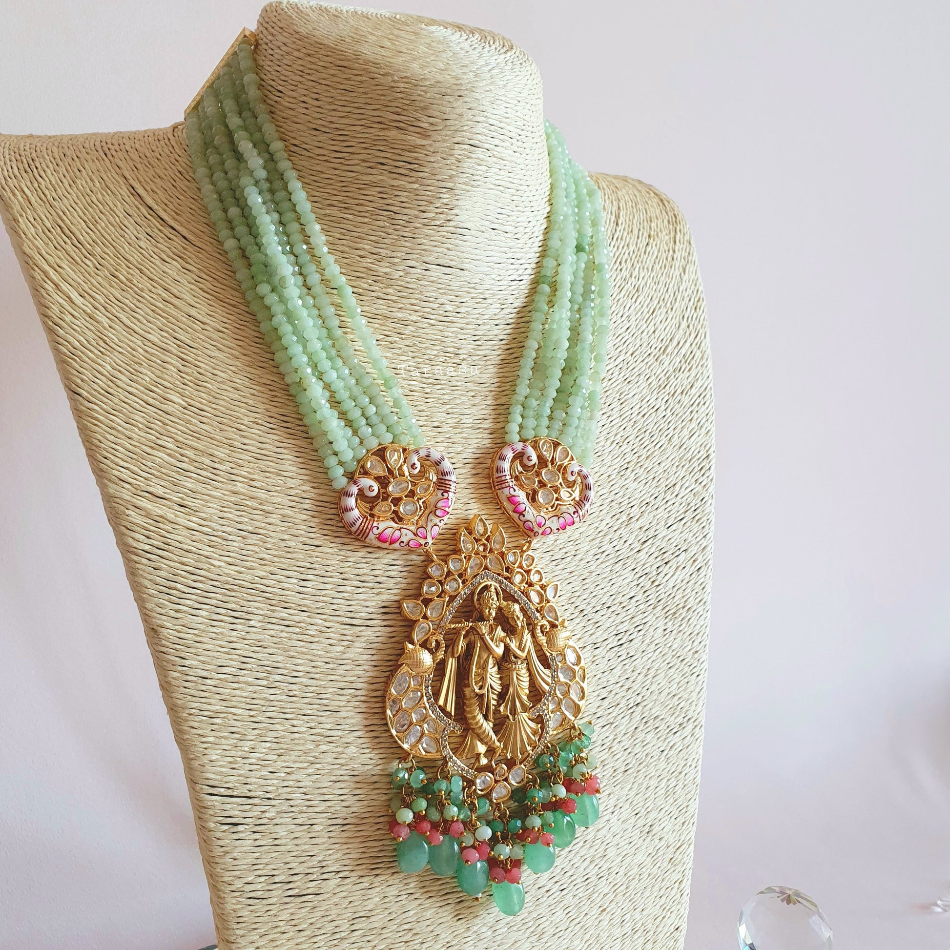Transcending eras, our signature Radha Krishna set is carved in a luxurious matte gold, engulfed with sparkling kundan stones and diamantes. Ropes of gorgeous mint colored beads join the pendant with painted pink peacocks. Drops of mint and pink beads add a whimsical final touch. It's simply breathtaking!