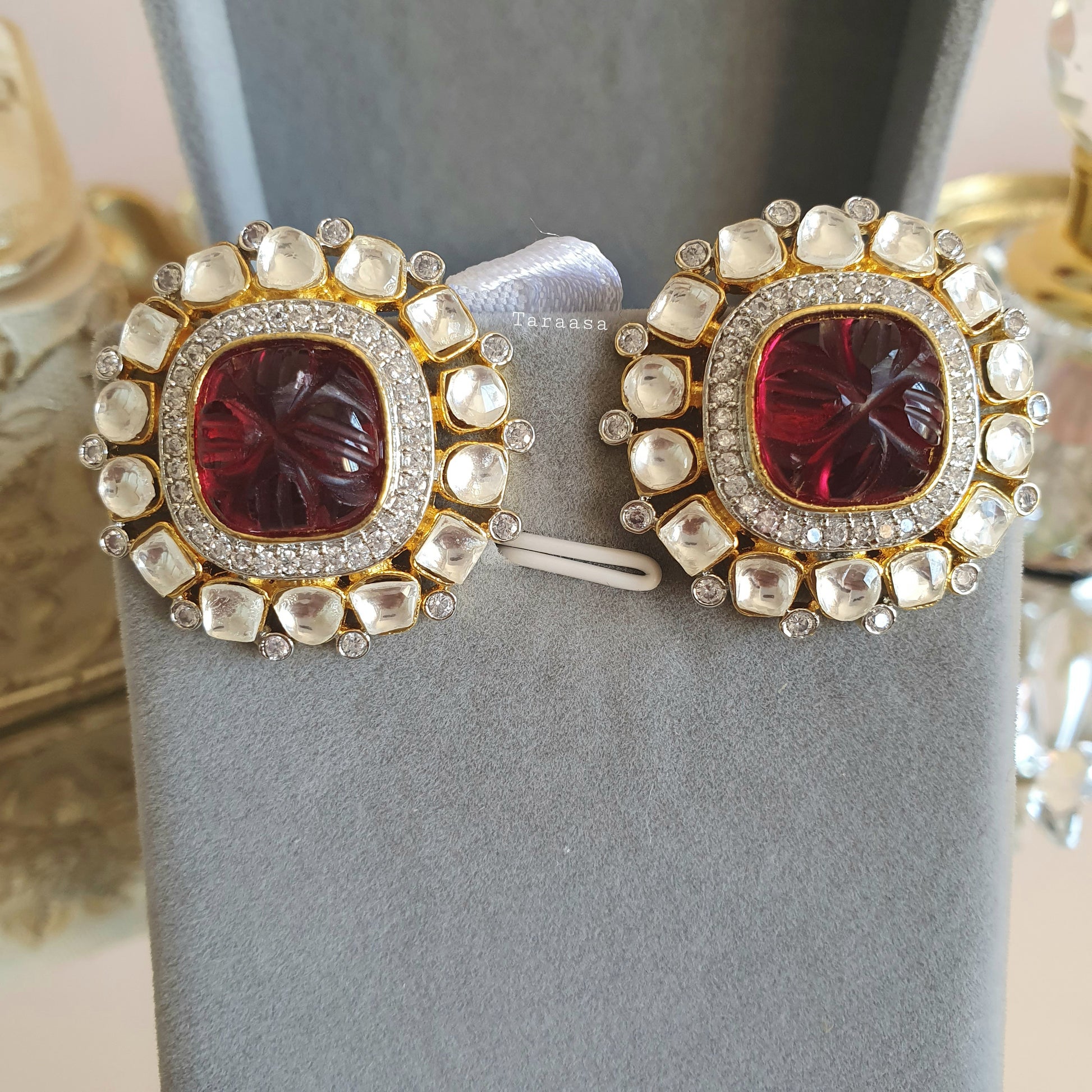 Our royal red over-sized stud earrings will be the prettiest jewels in your collection! These classic, versatile studs features engraved glass stones, surrounded by diamantes and kundan stones, finished in 18K gold plating.