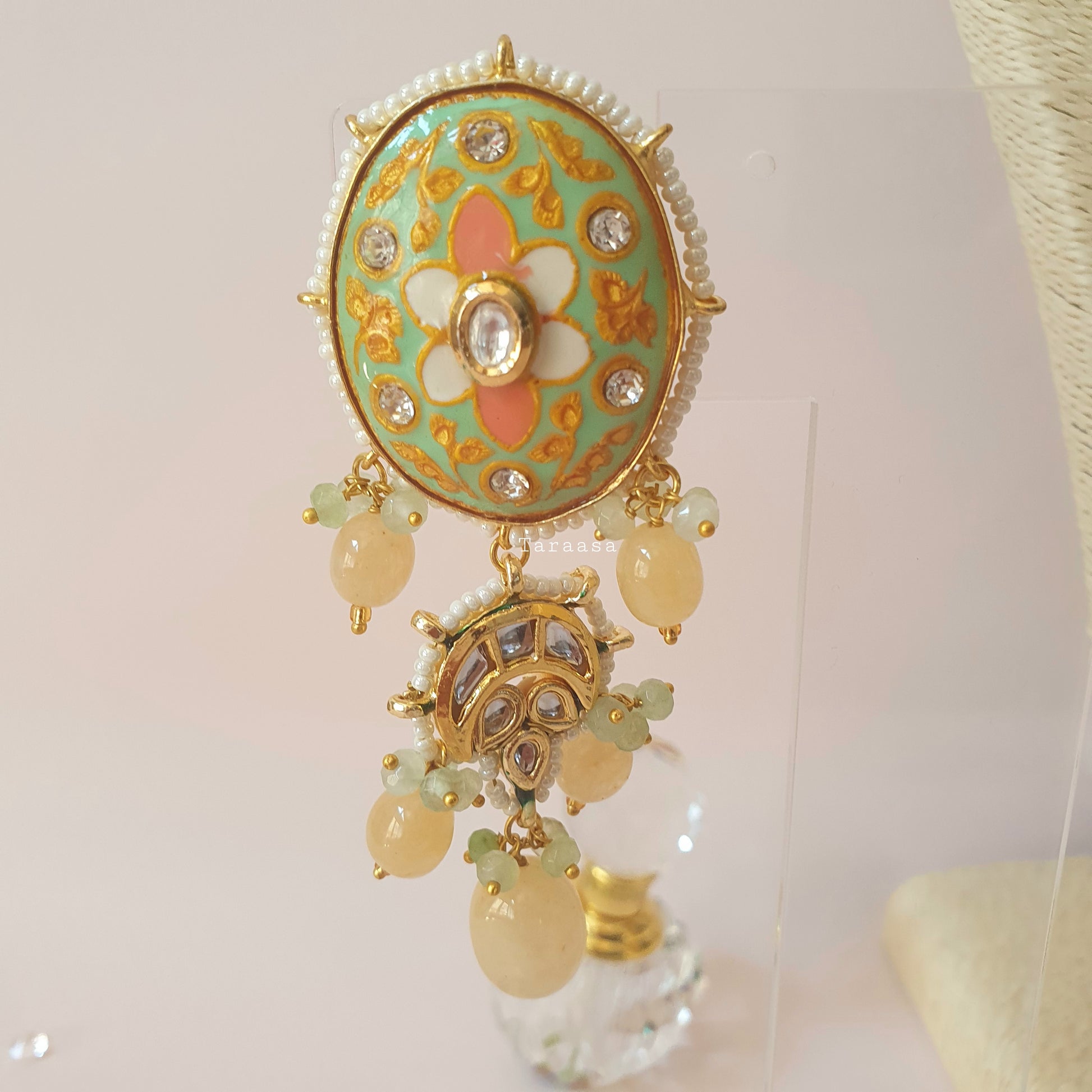 An exquisite pista and peach meenakari necklace that radiates elegance and artistry. Delicate ropes of shimmering crystal beads cascade gracefully, meeting a statement pista and peach meenakari centerpiece adorned with intricate detailing and kundan stones. This necklace blends traditional craftsmanship with contemporary sophistication. A pair of oversized matching earrings completes this set.