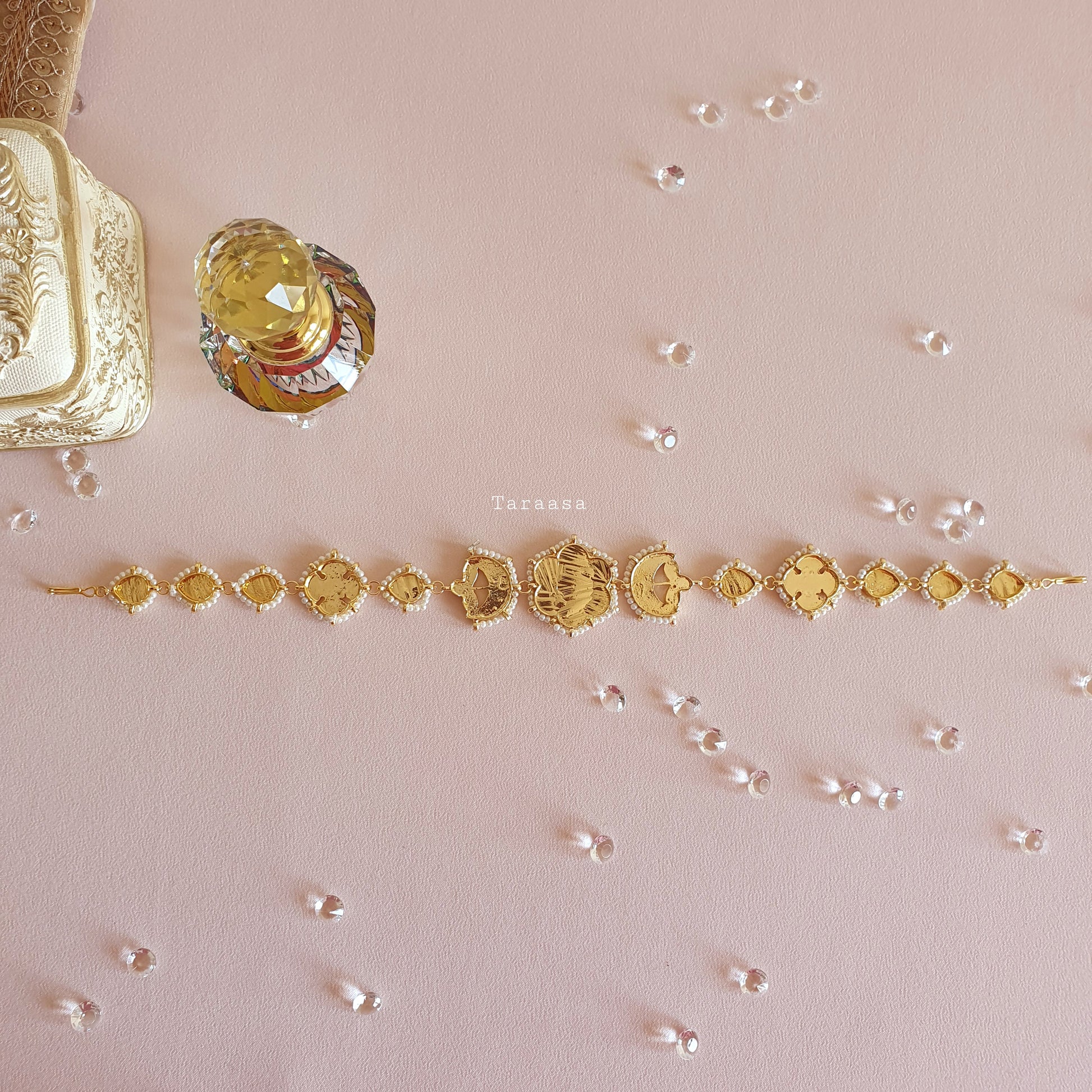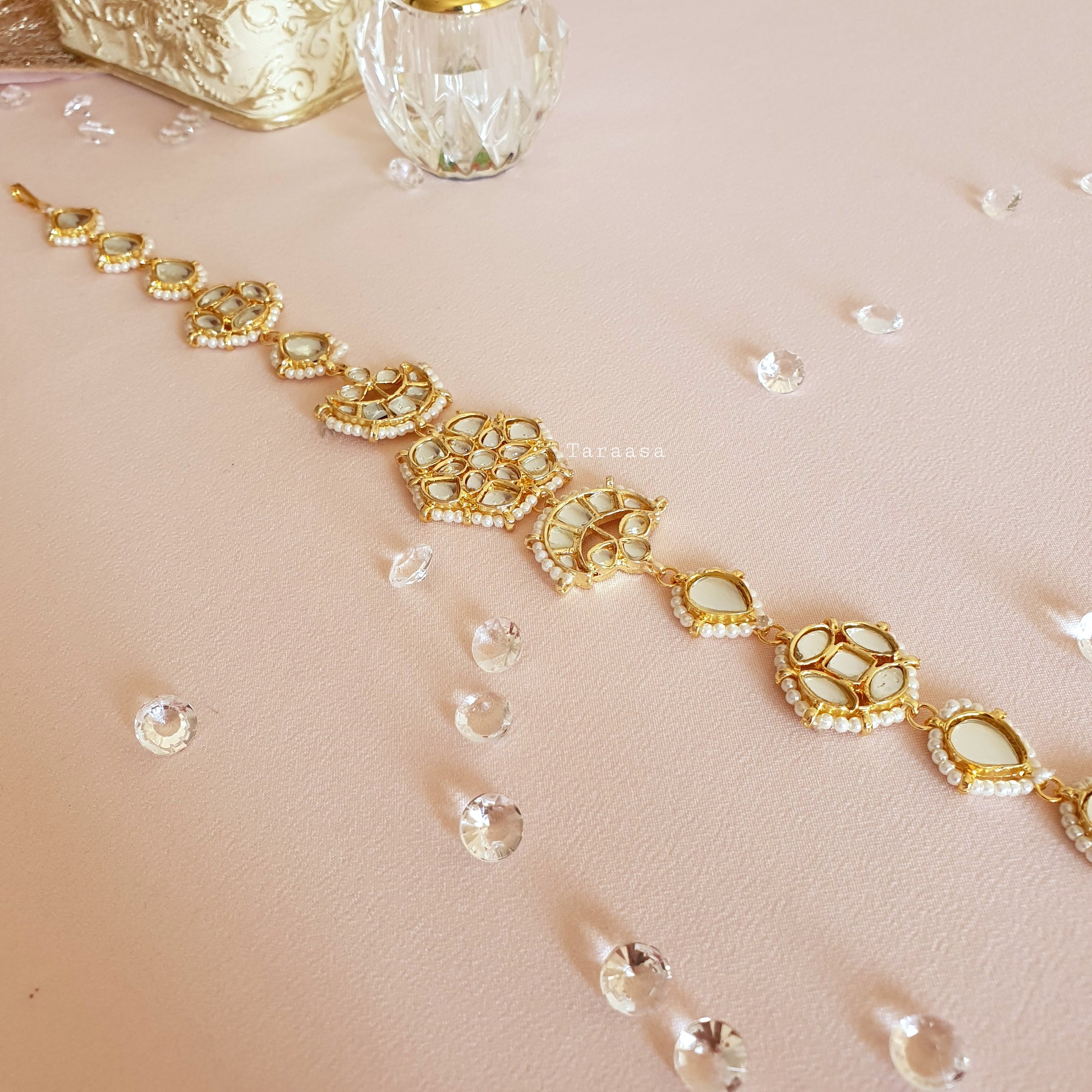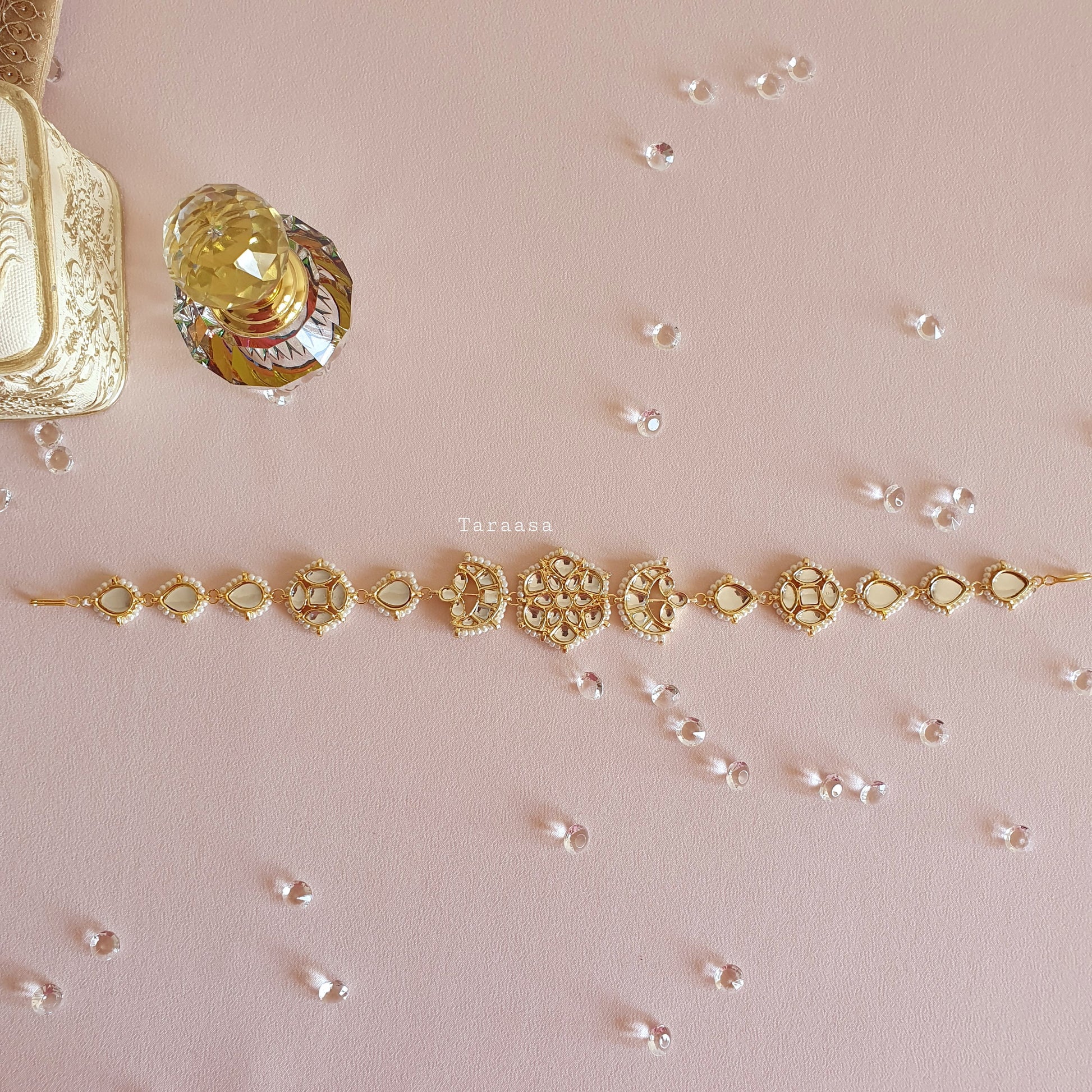 Add a royal yet modern touch to your look with our sheeshpools! Wrapped in gold with kundan stones and surrounded by the finest pearls. Wear it on its own, pair it with your tikka or matapatti, or rock it as a choker! Every woman needs one!
