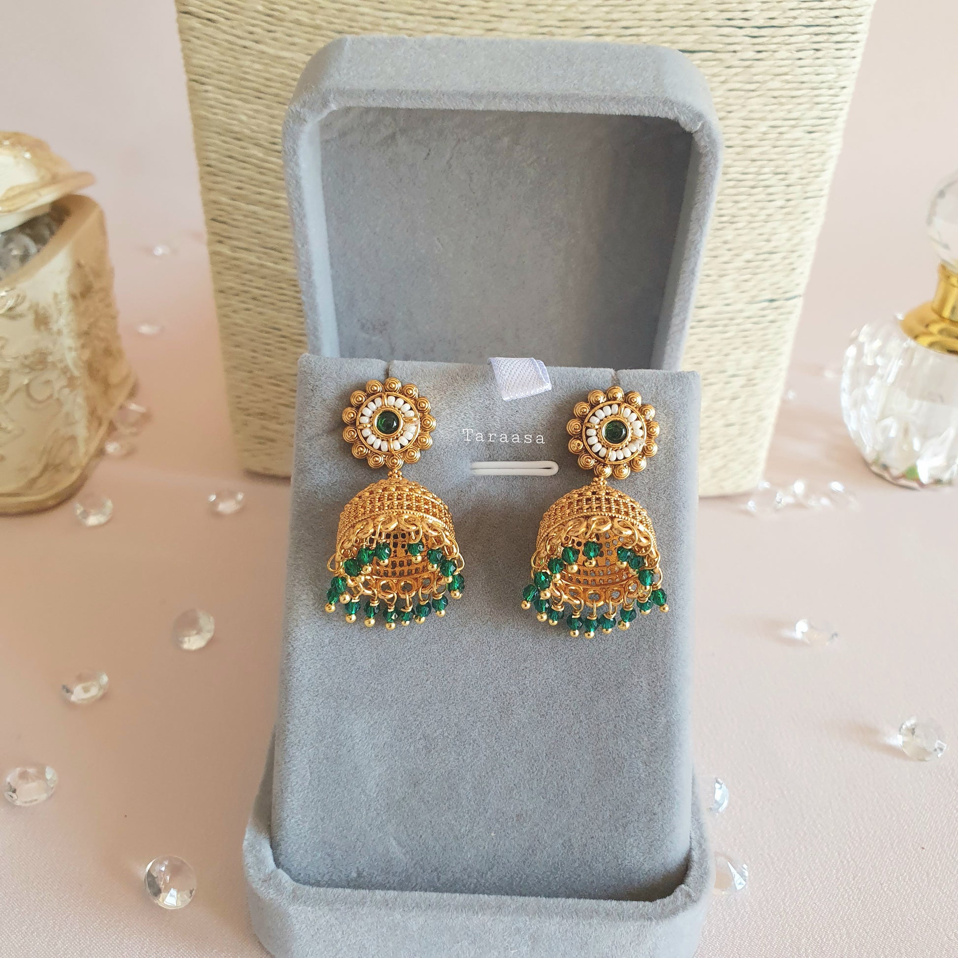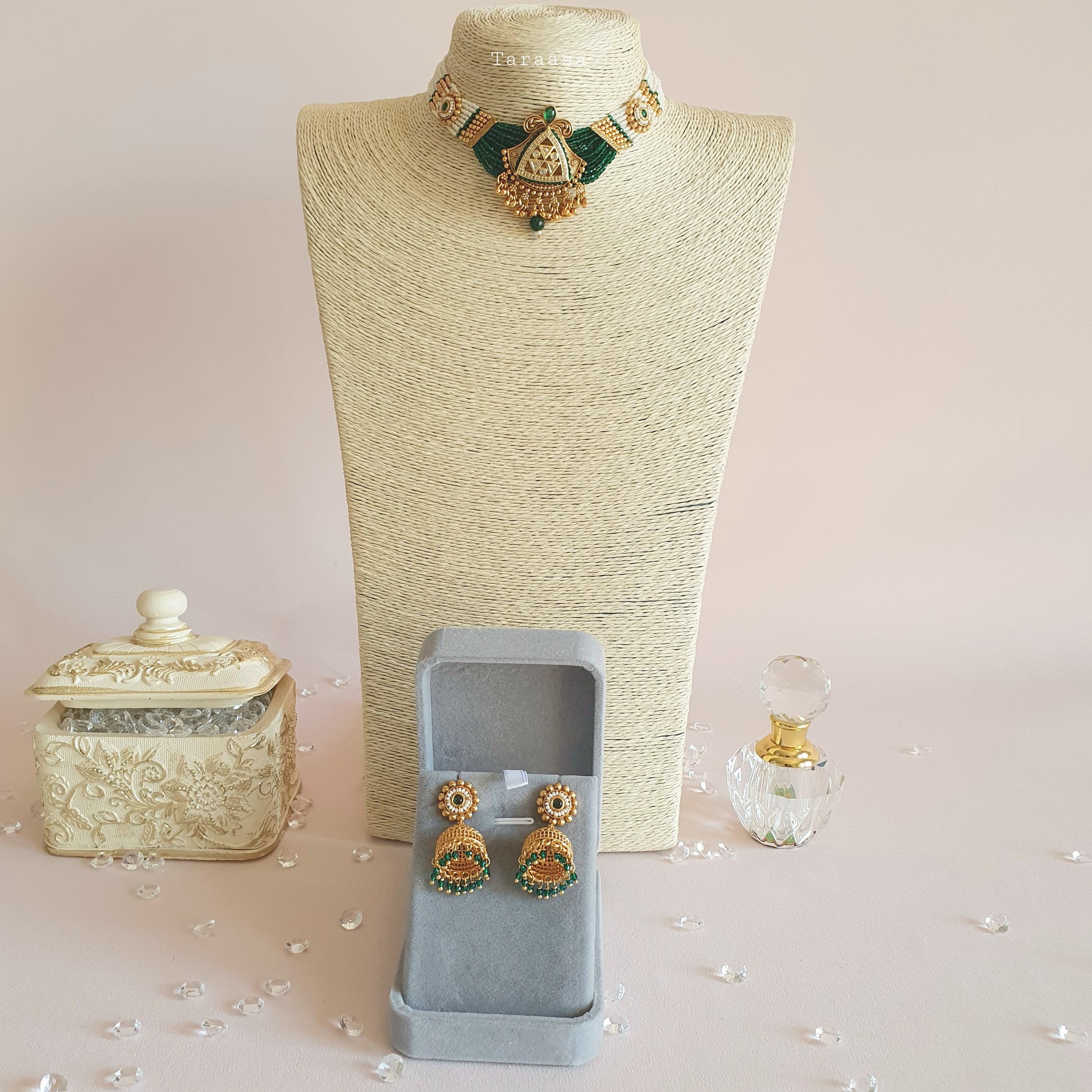 The touch of American diamonds and crystal stones adds a luxurious sparkle. This is paired with a traditional jumkhi earring. A very dainty set, which creates an air of elegance and class.
