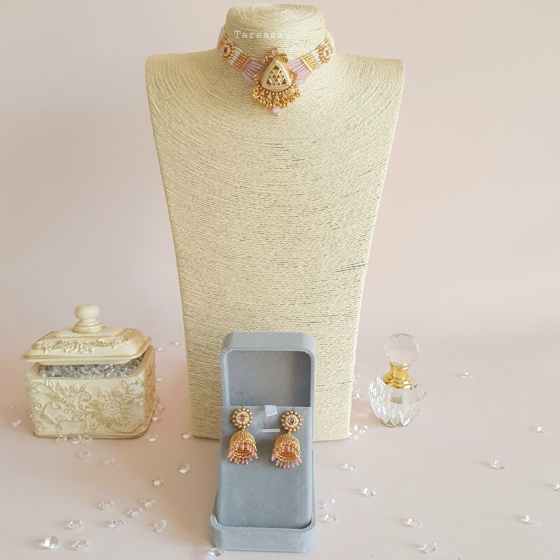 This elegant South Indian inspired choker is set in a gorgeous matte gold with alternating gold beads and white seed beads, as well as ropes of light pink crystals which is centered by an intricate 3D pendant.