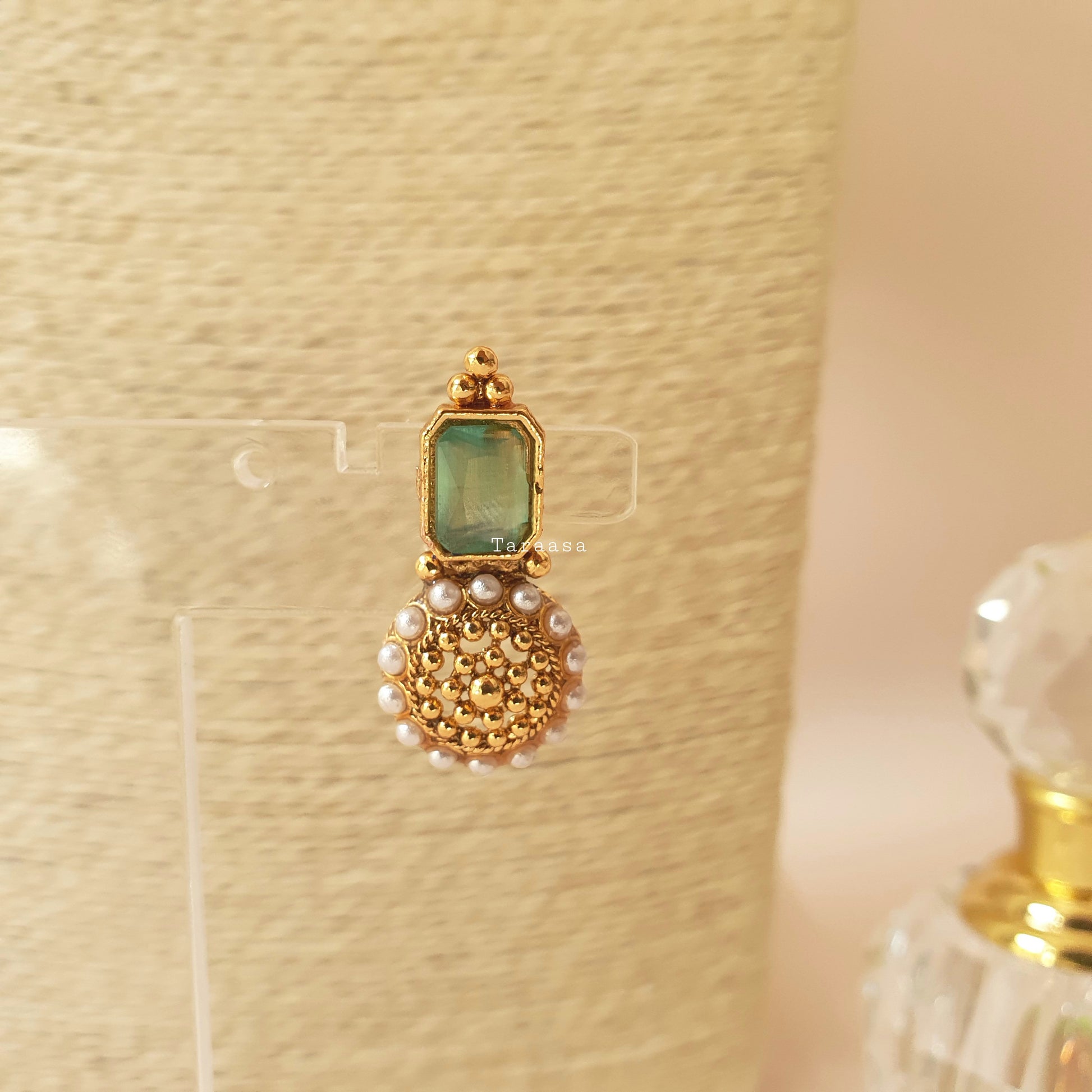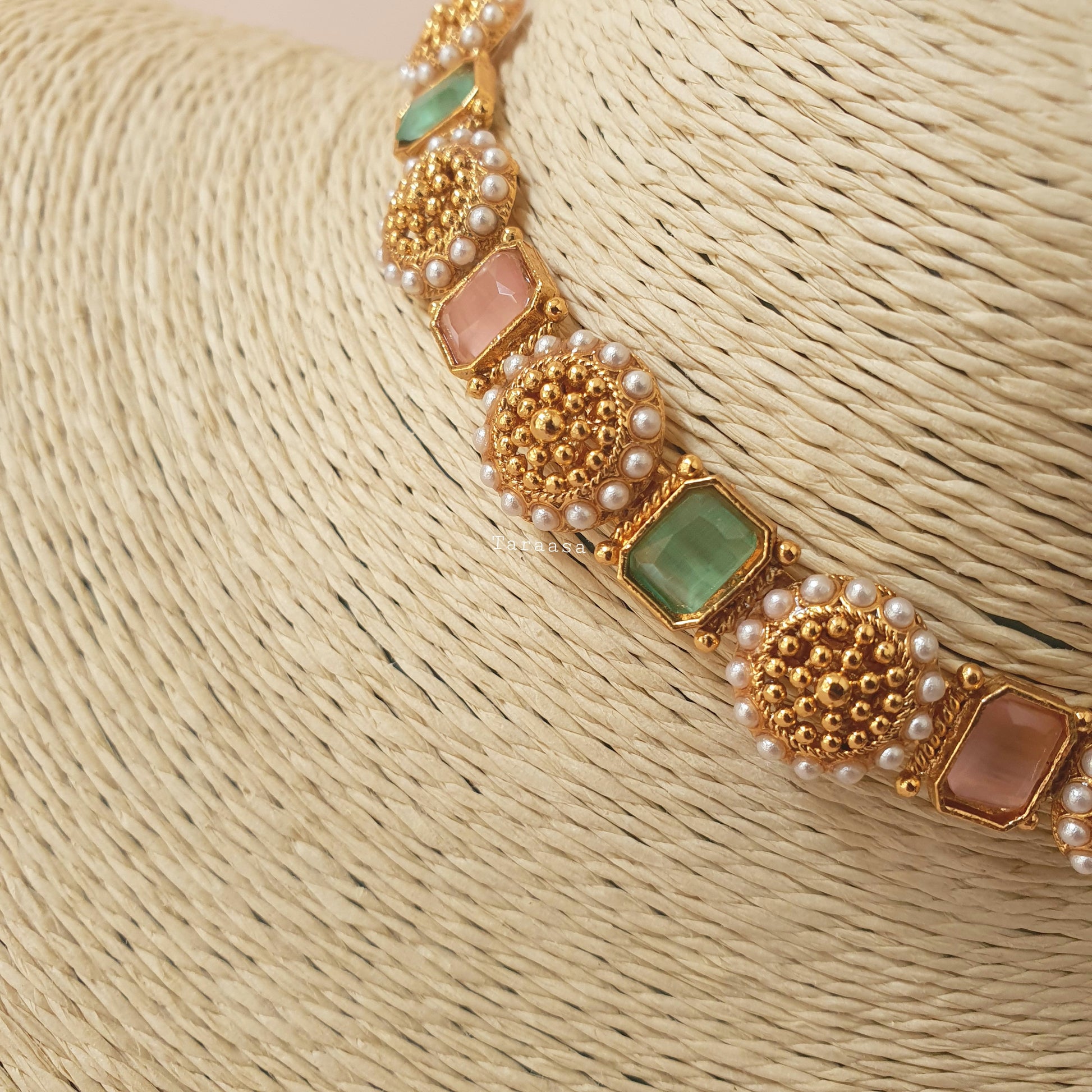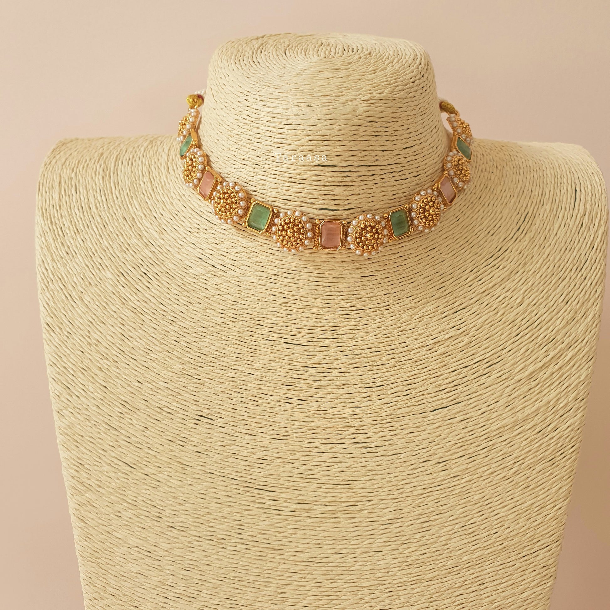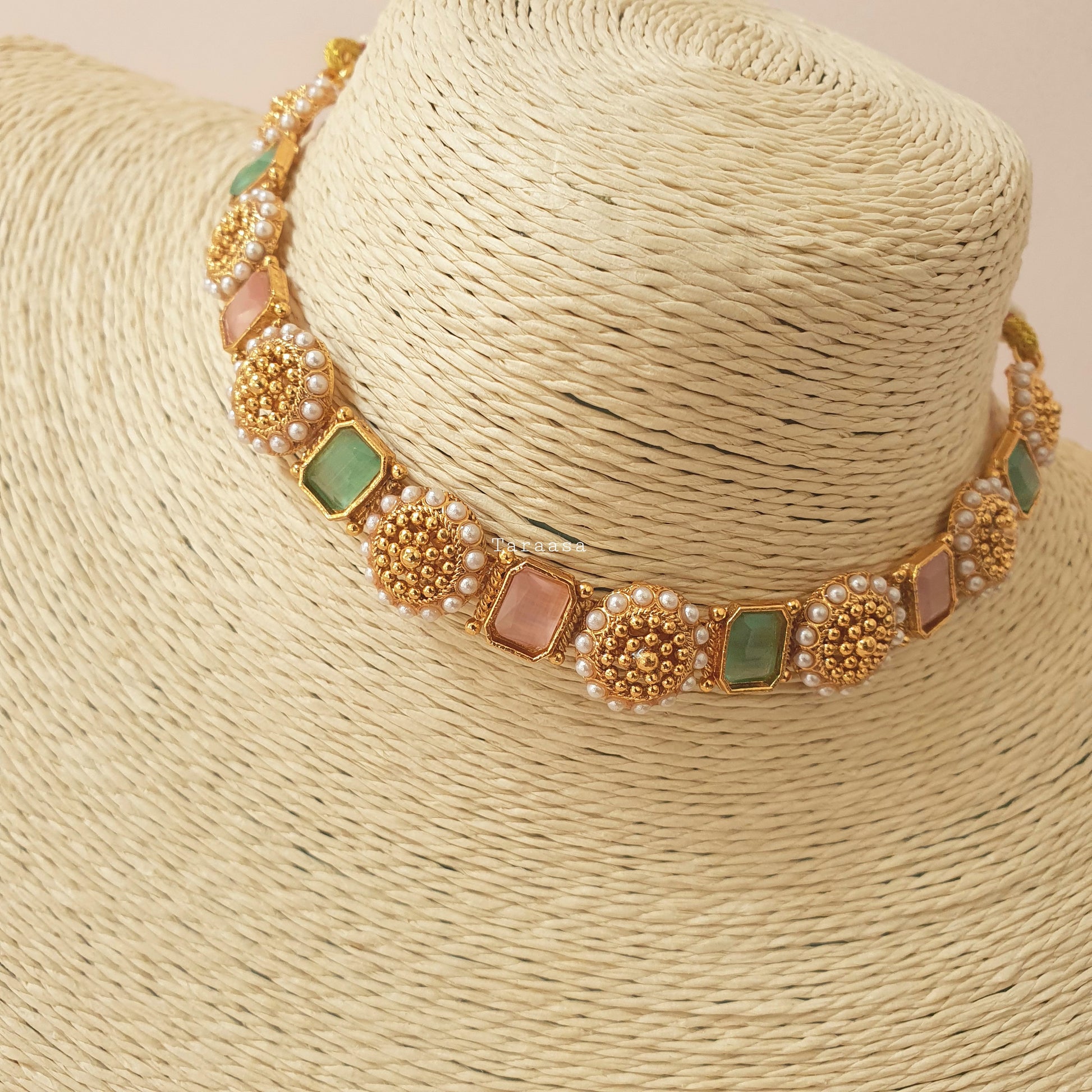 A beautiful harmony of tradition and modernity, this gold-toned set is exquisitely finished with alternating tiny pearls and gleaming glass stones. Delicate drop earrings add the perfect final flourish, completing a look that is both timeless and versatile — effortlessly suited for every generation, from the little ladies to our elegant grandmothers.