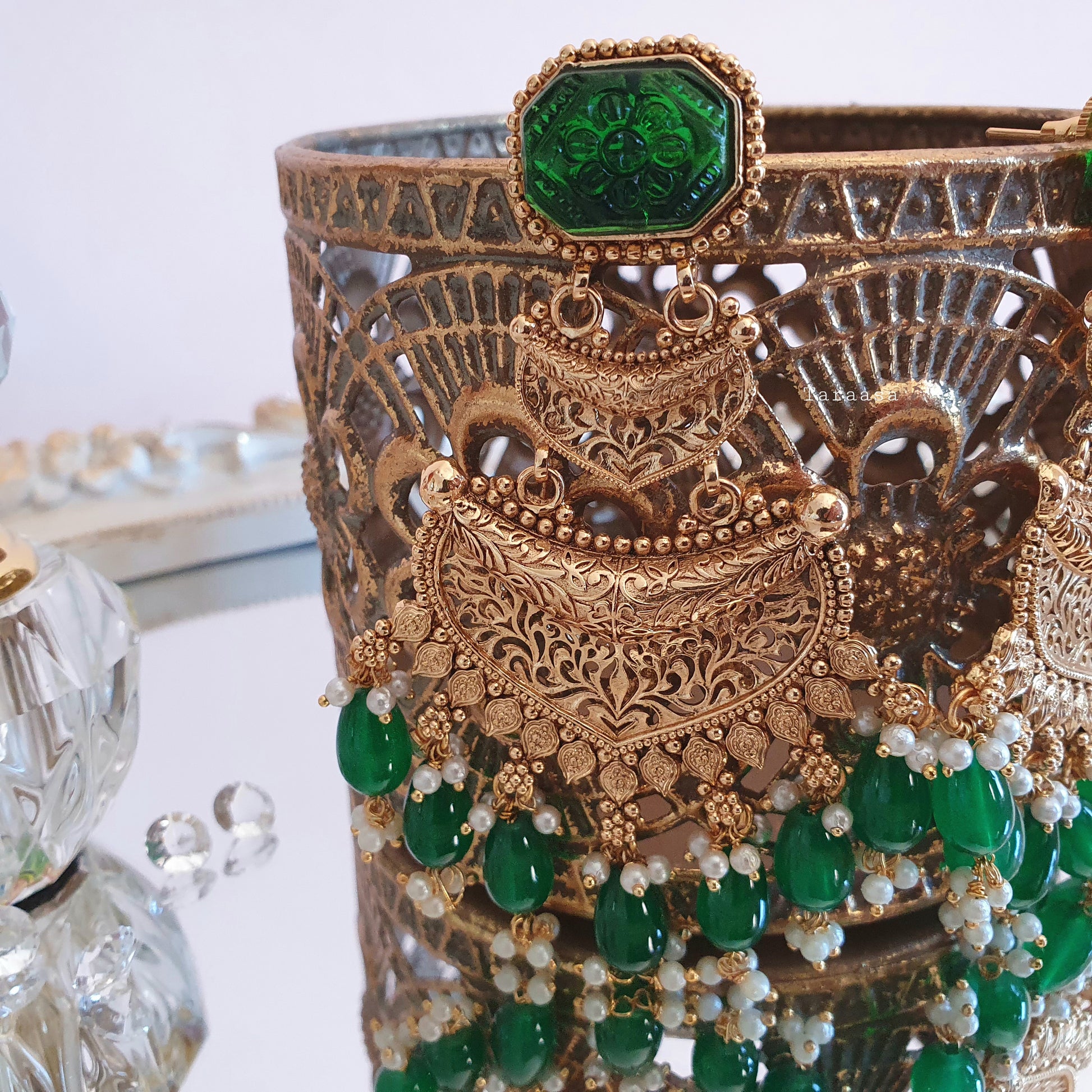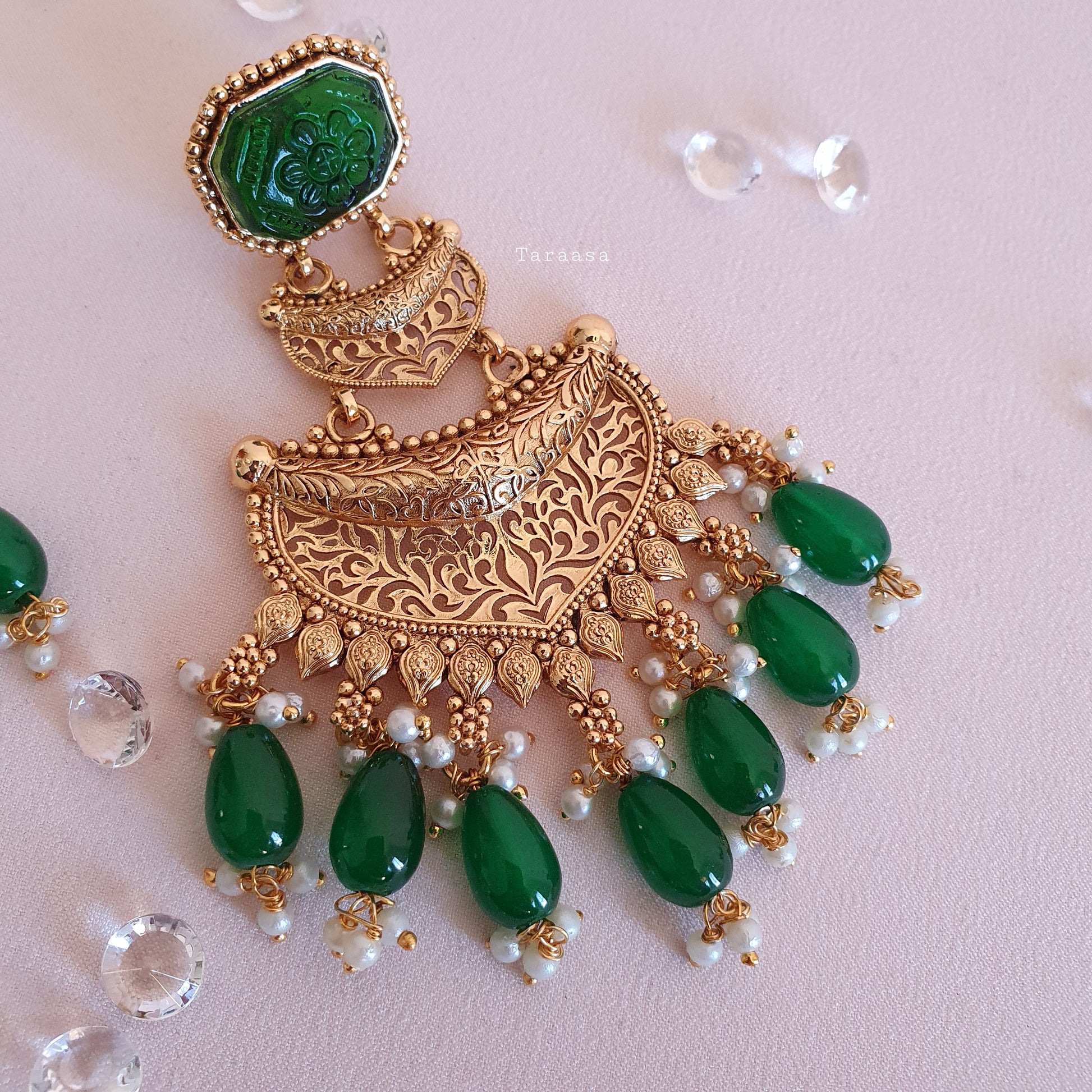 Complete with traditional motifs in intricate cutwork, our latest traditional earrings have a vintage vibe with an emerald carved glass stone and matching beads. These earrings make for an impressive style statement at weddings and festive occasions.