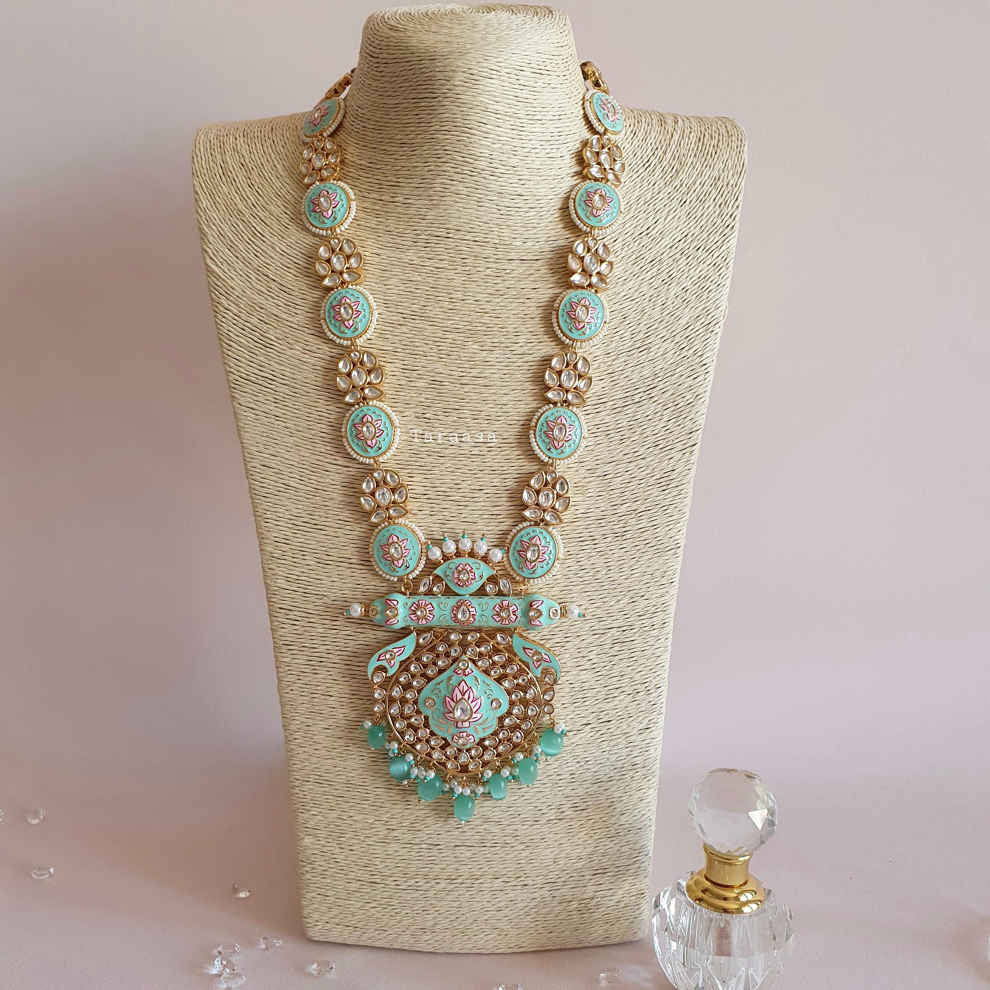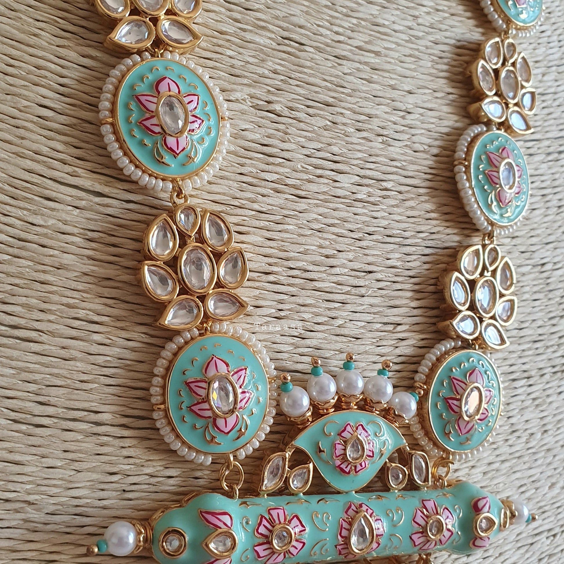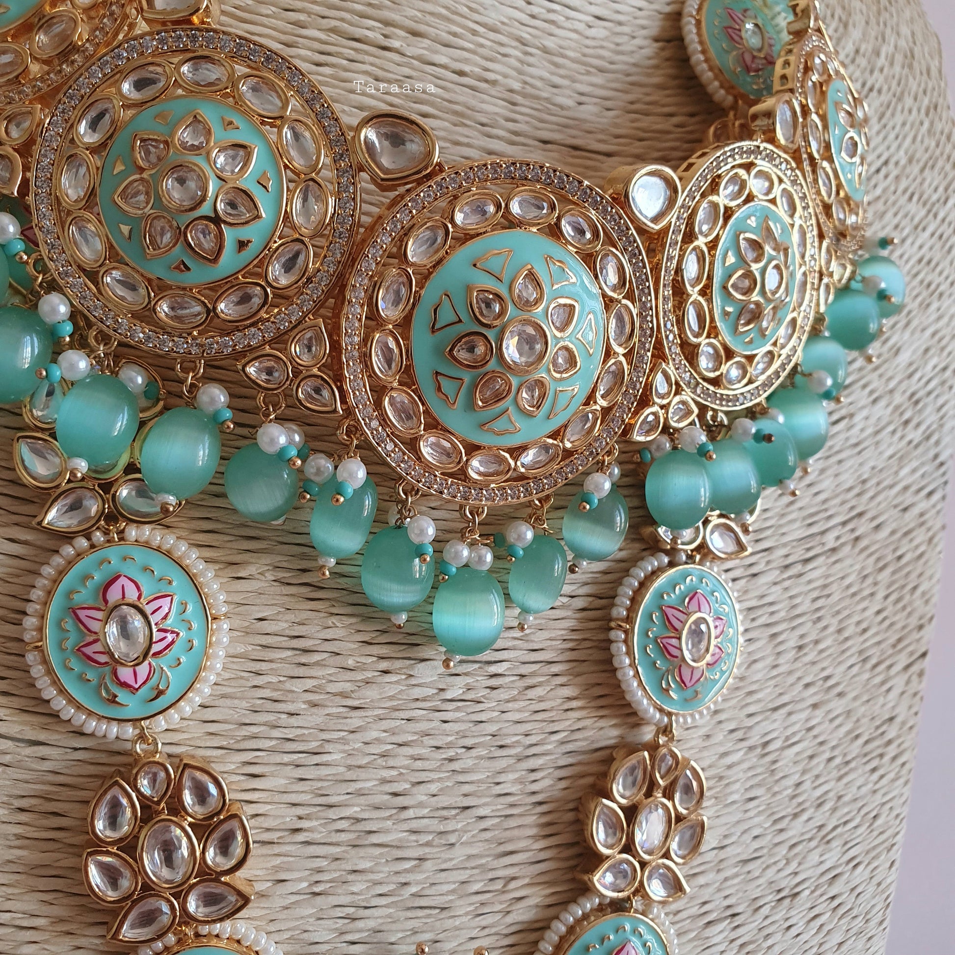 The turquoise meenakari is set in a luxe gold with crystal stones. The haar is a masterpiece, petite florets and meenakari lotus flowers combined with the drops of turquoise beads and pearls make this set fit for a queen.