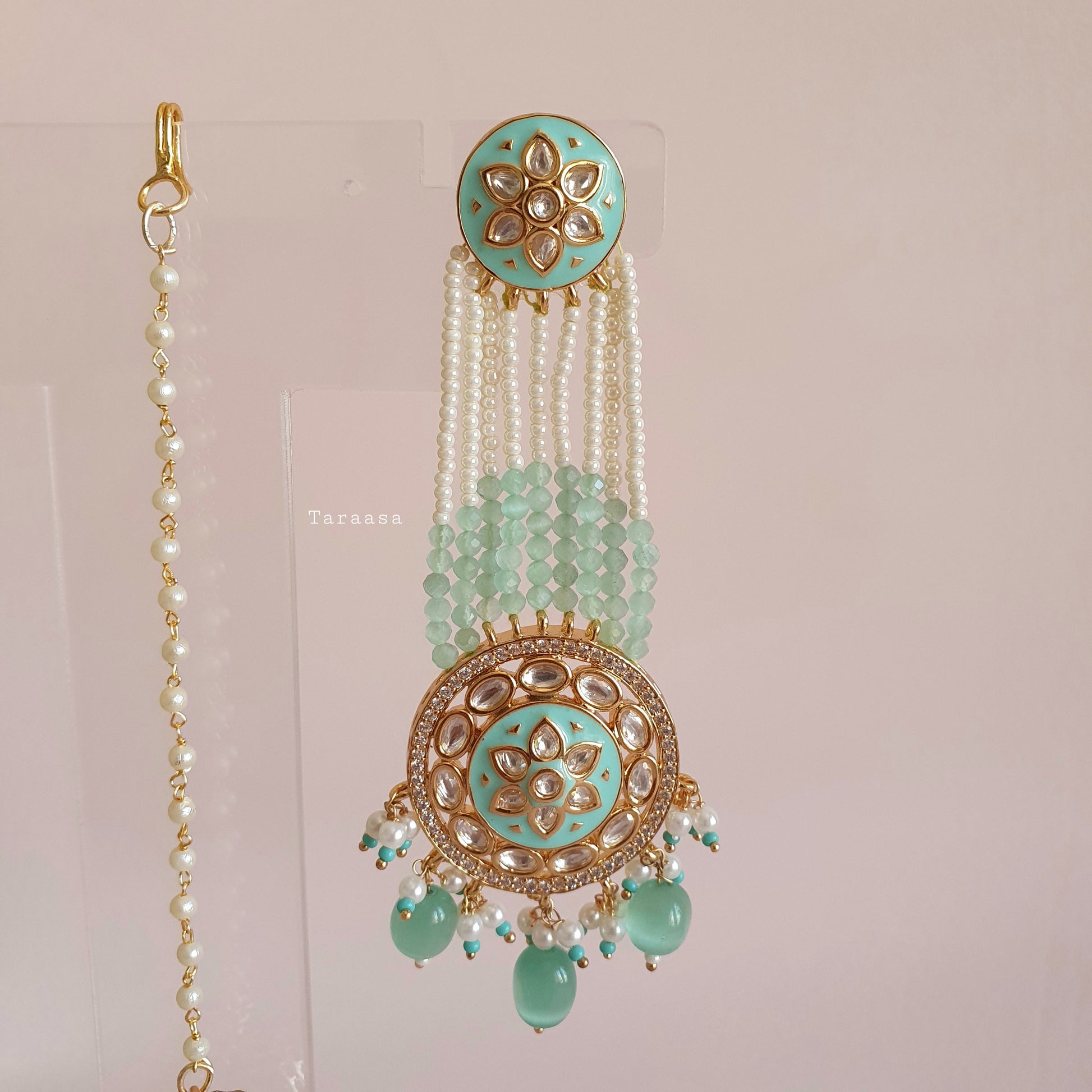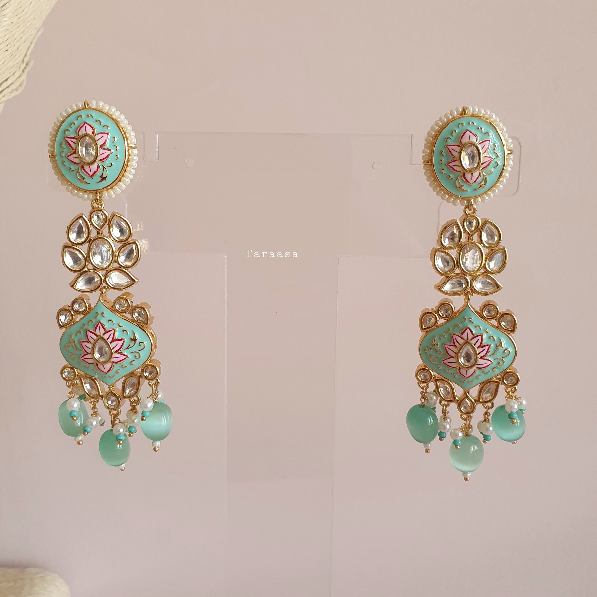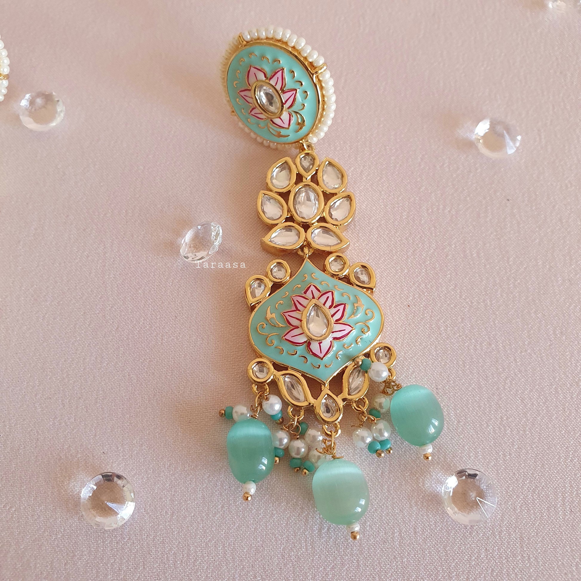 The turquoise meenakari is set in a luxe gold with crystal stones. The haar is a masterpiece, petite florets and meenakari lotus flowers combined with the drops of turquoise beads and pearls make this set fit for a queen.