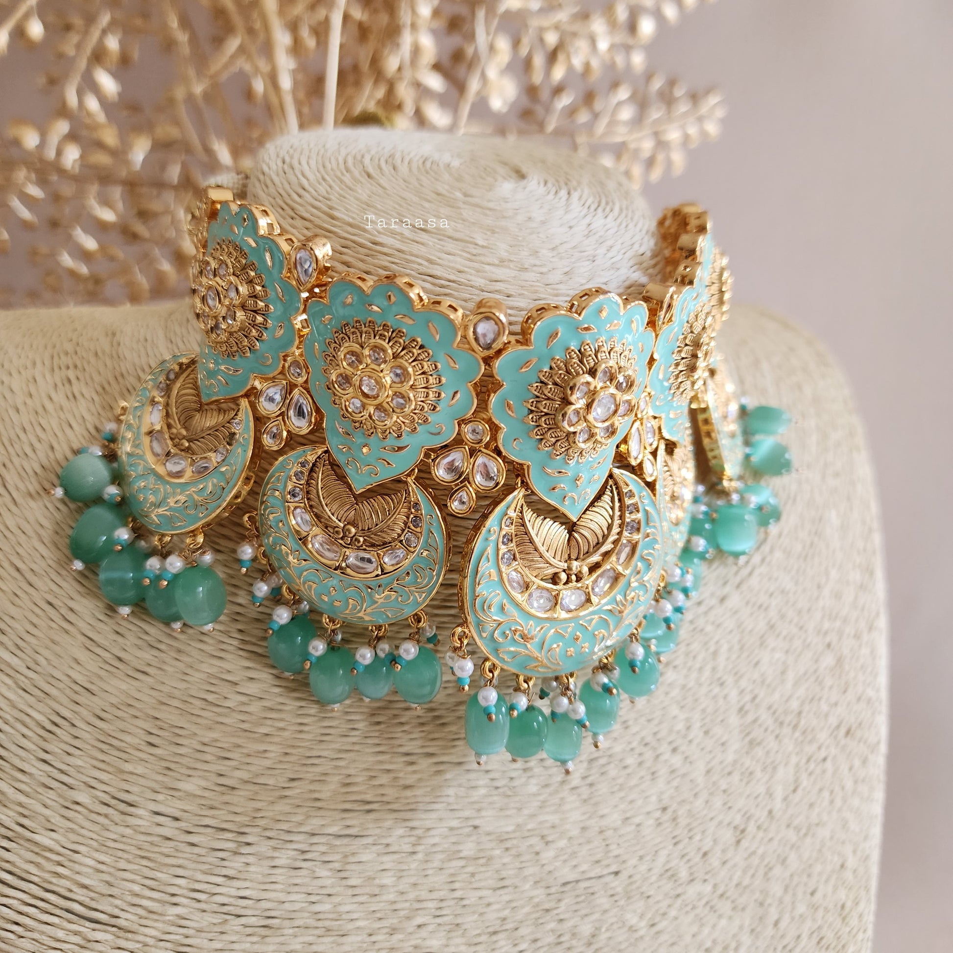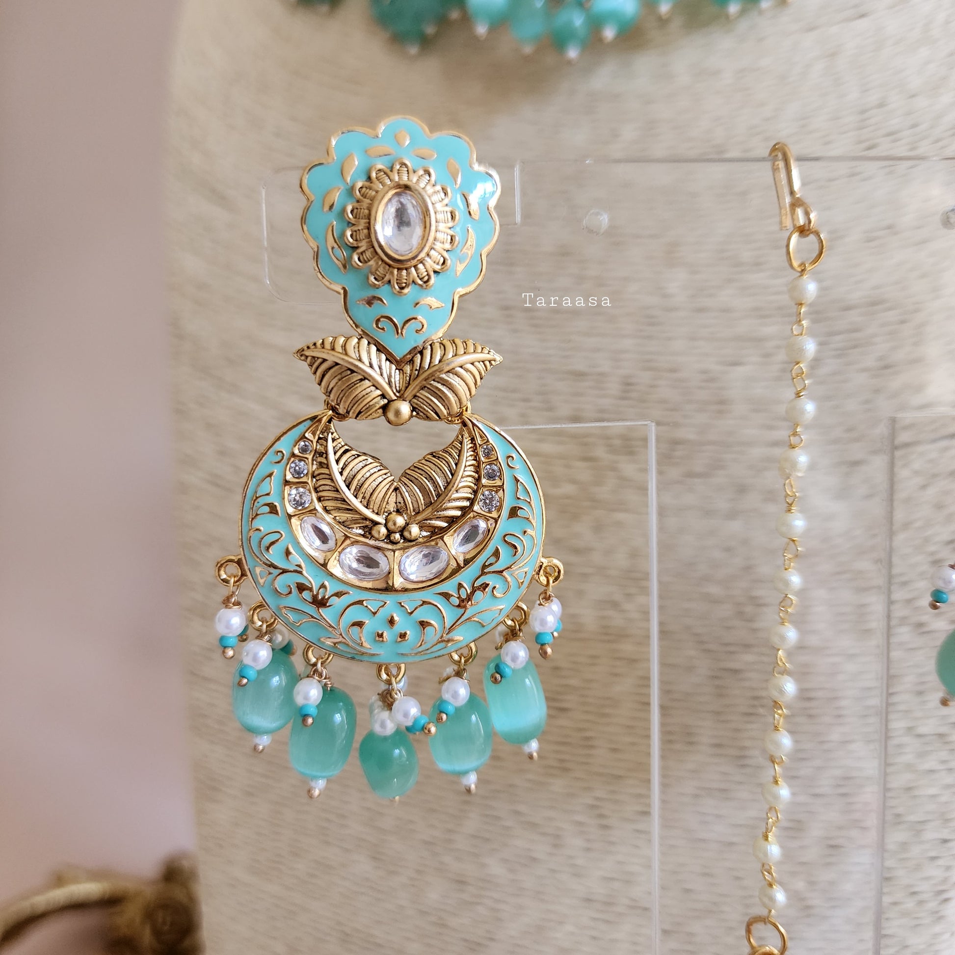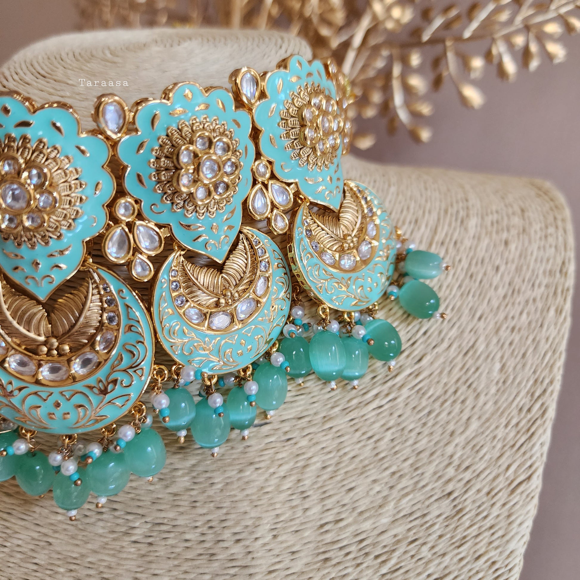 Sparkling kundan stones are set in exquisite gold, carved into turquoise meenakari. Flowers and leaves painted in gold with drops of pearls and turquoise beads complete this masterpiece.