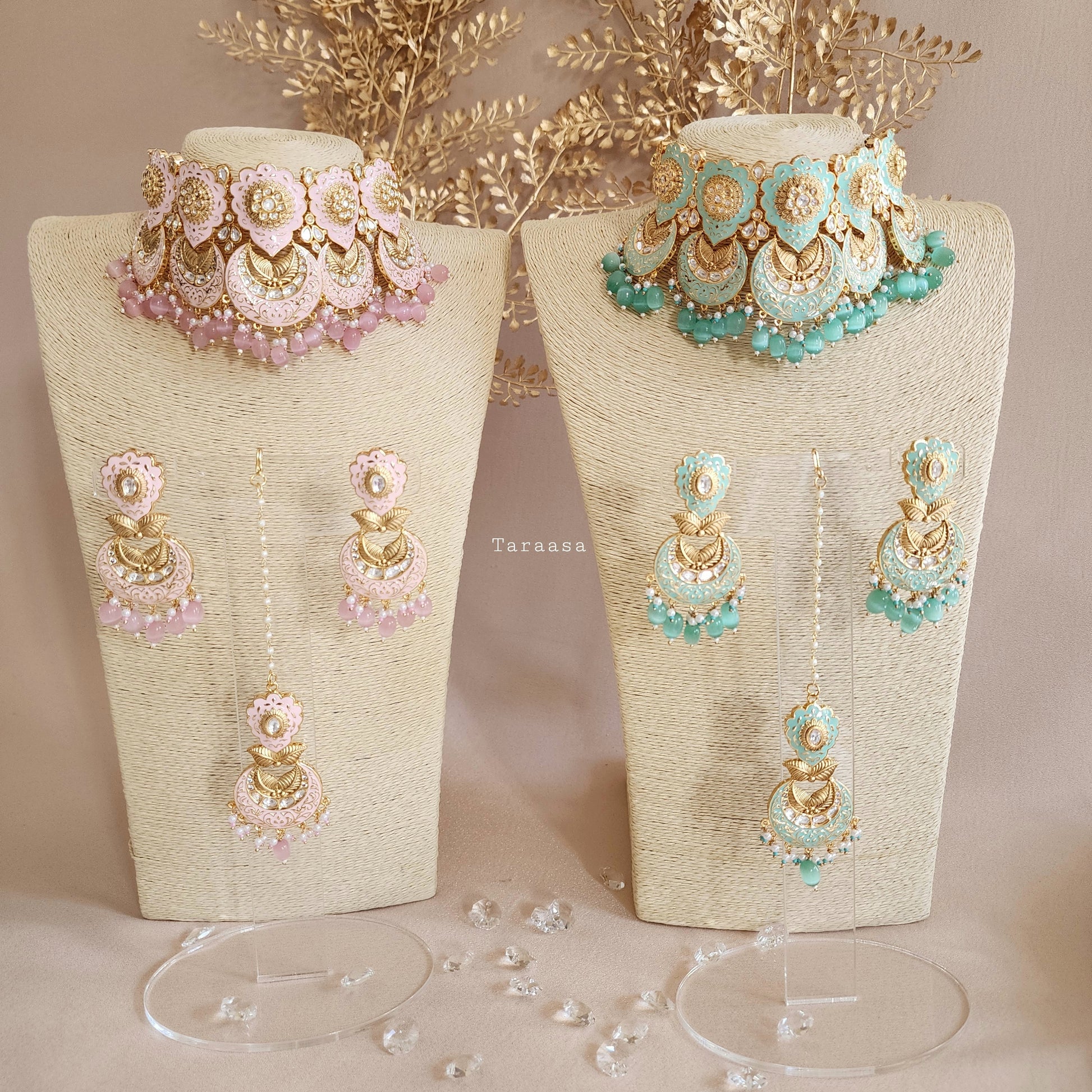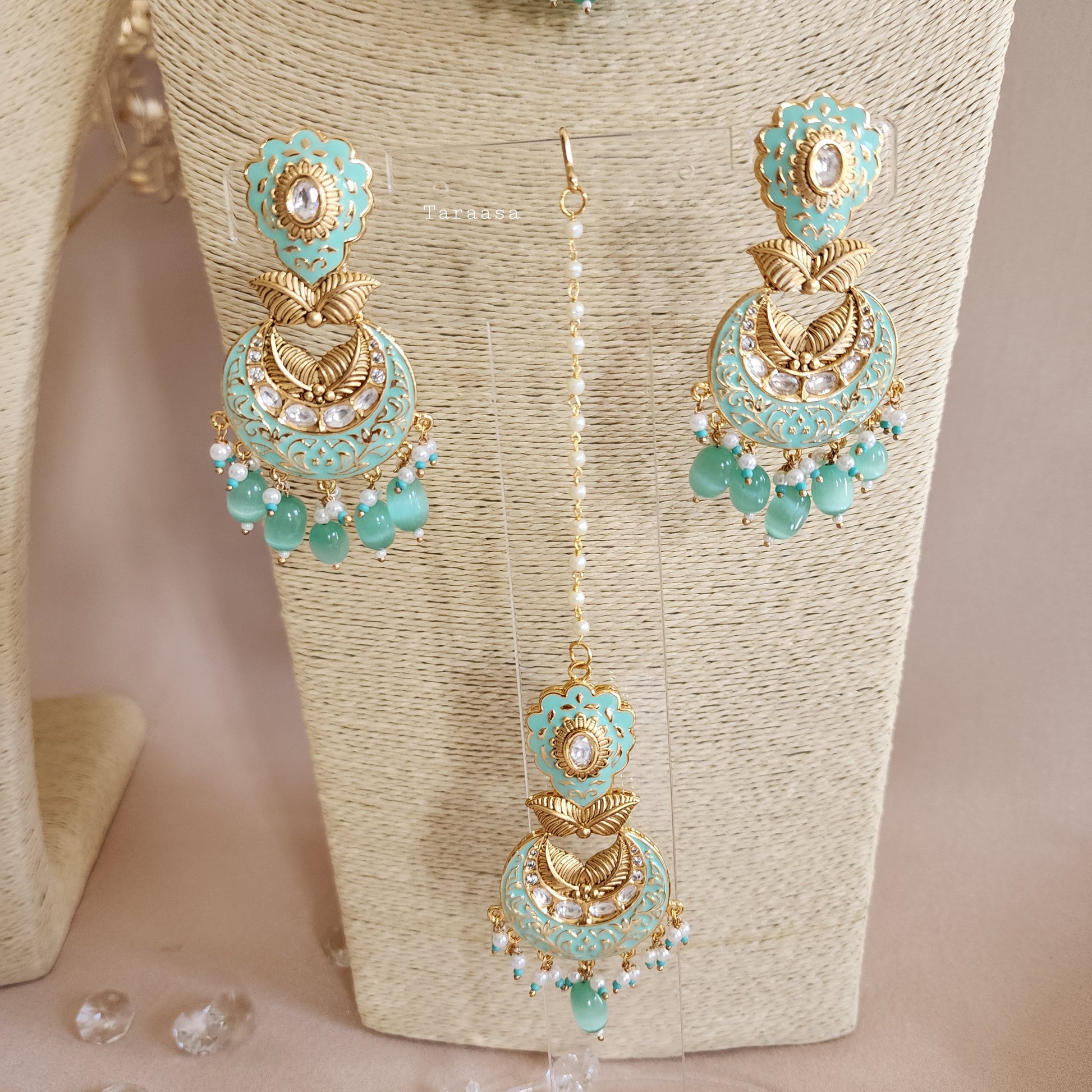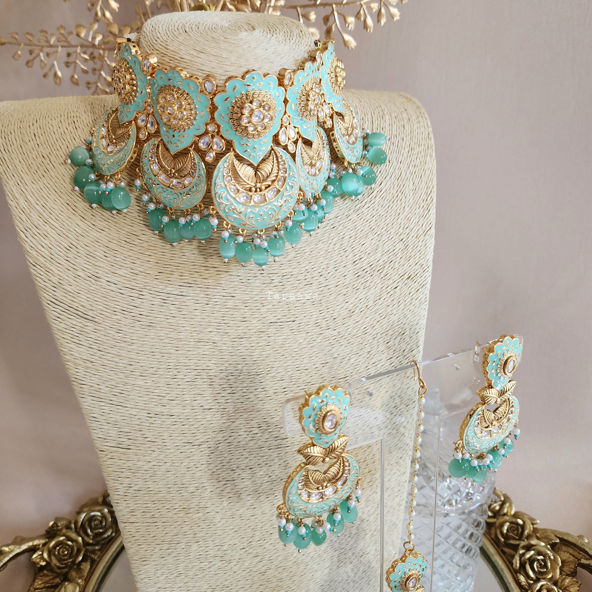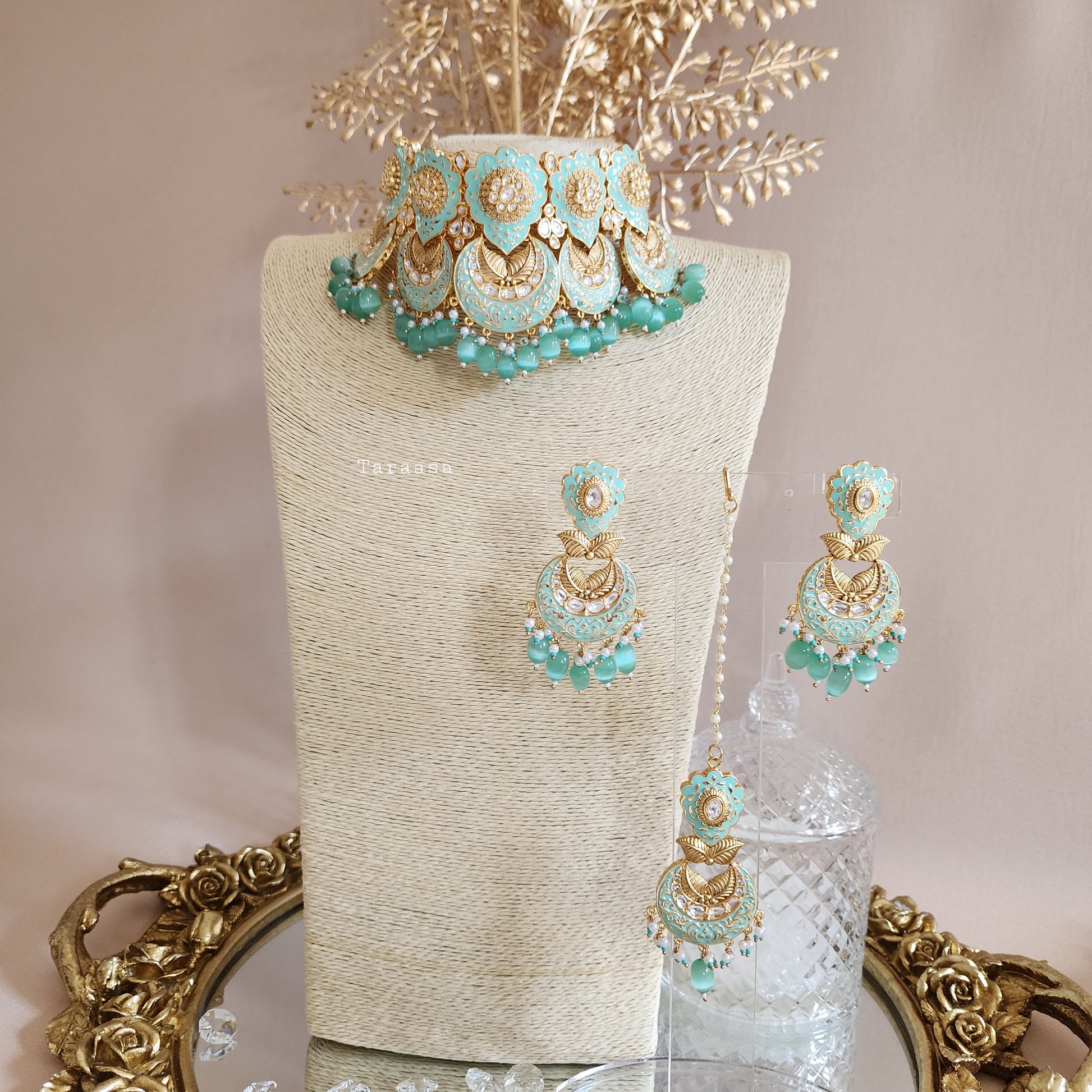 Sparkling kundan stones are set in exquisite gold, carved into turquoise meenakari. Flowers and leaves painted in gold with drops of pearls and turquoise beads complete this masterpiece.