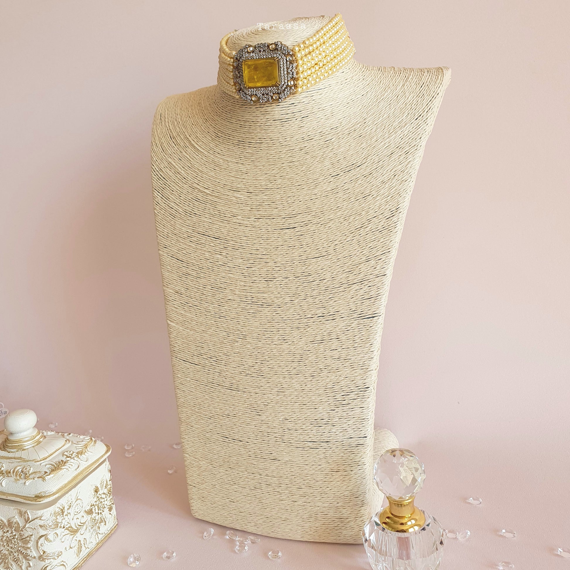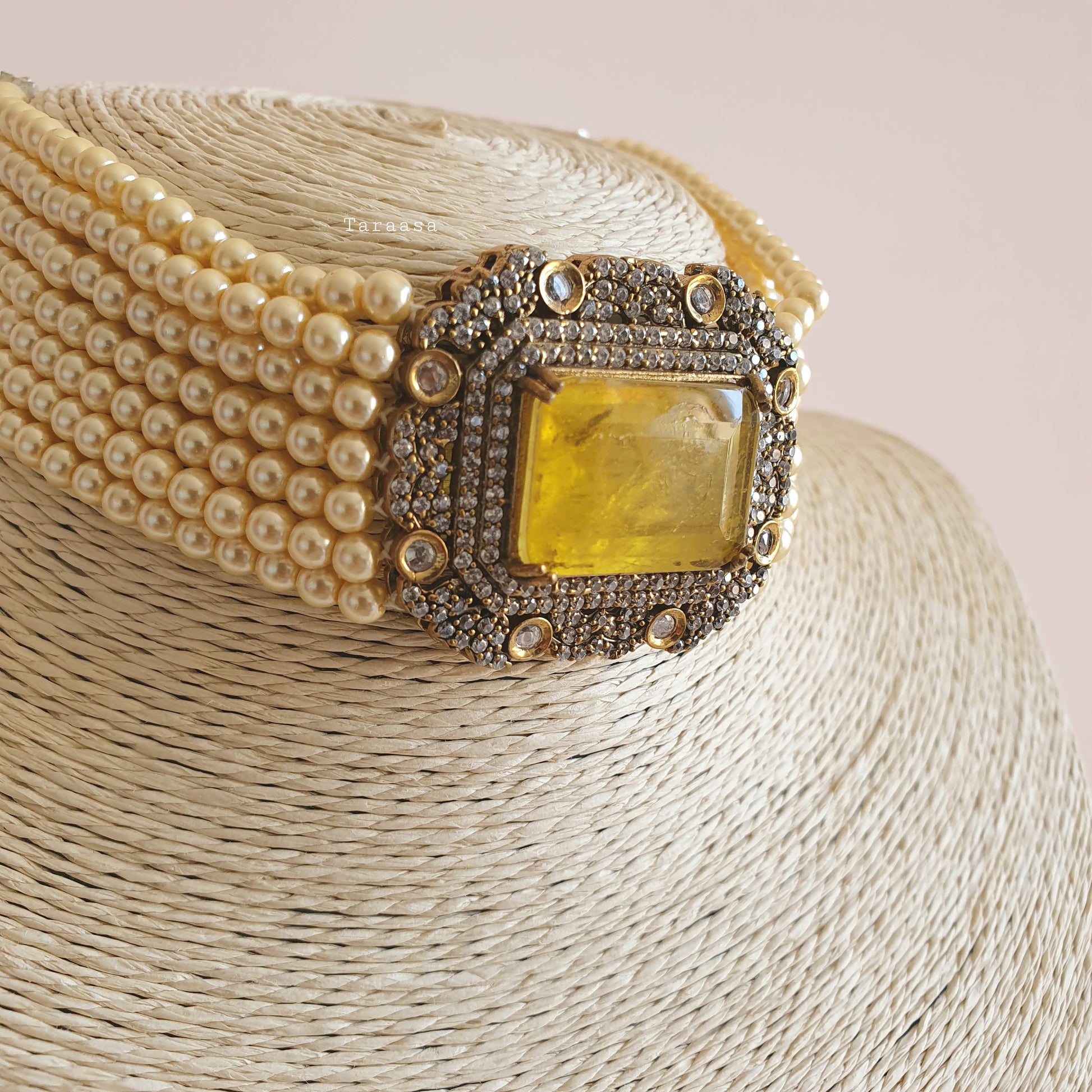 Drape yourself in unparalleled elegance with this exquisite pearl choker set! Set with gold and silver, this choker gives you the best of both worlds. The side chains of pearls add such splendor to the overall look with a mesmerizing large, semi-precious, citrine yellow stone in the center.