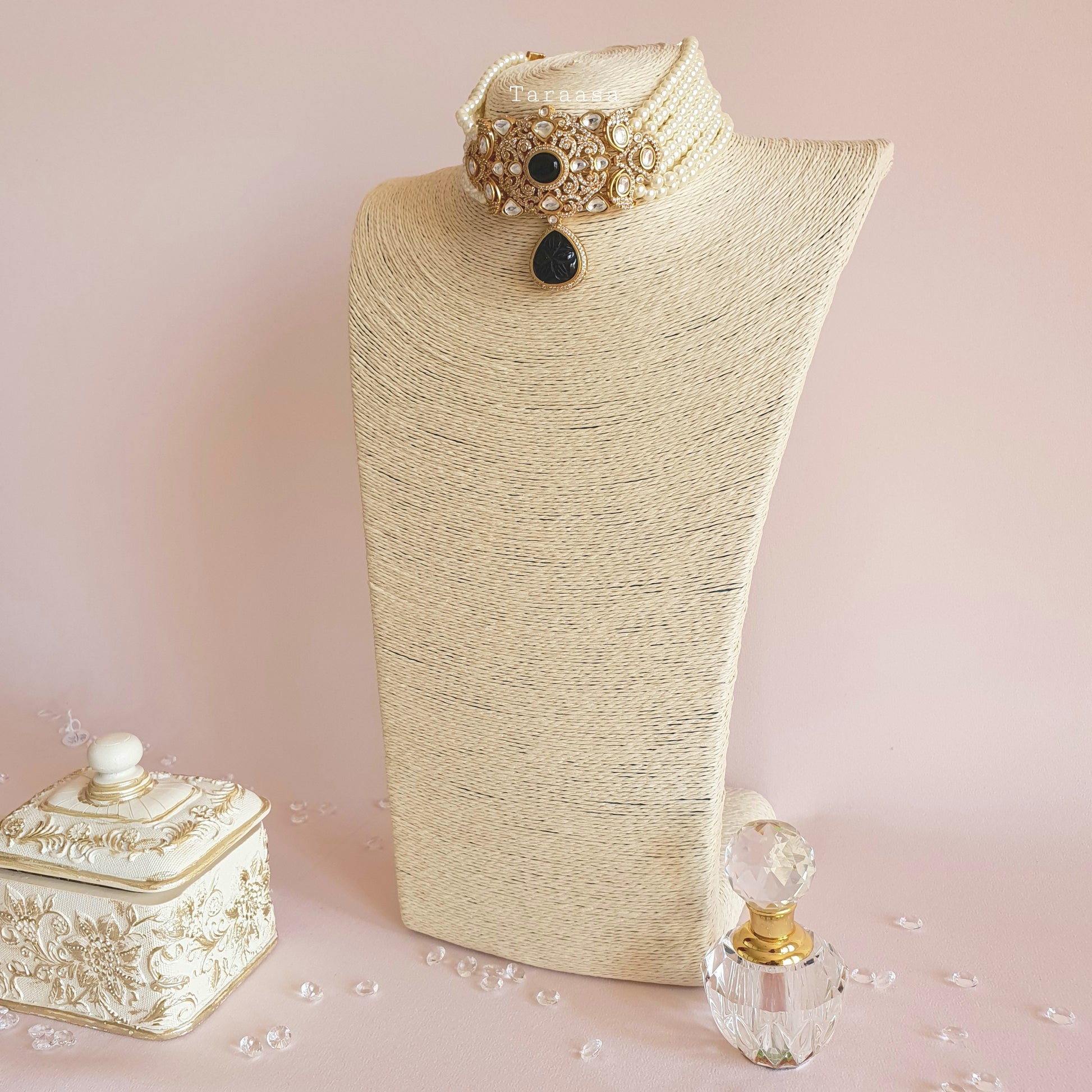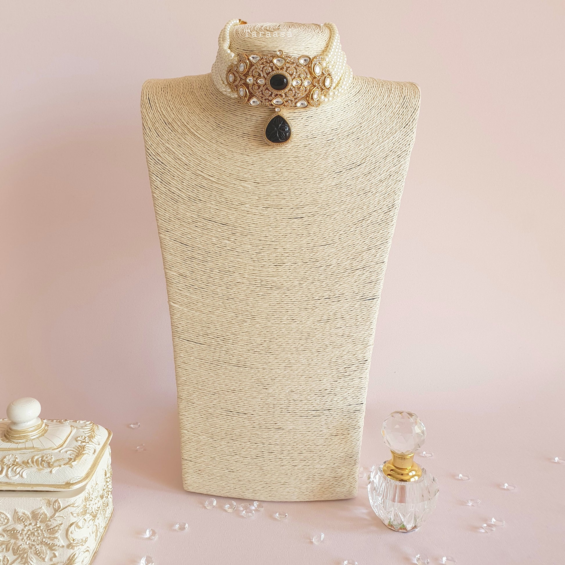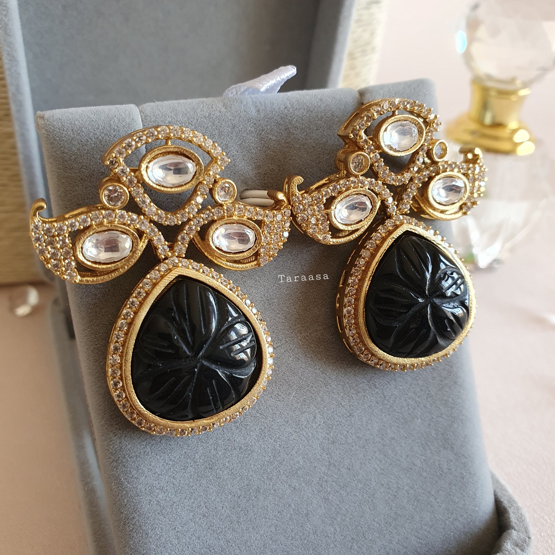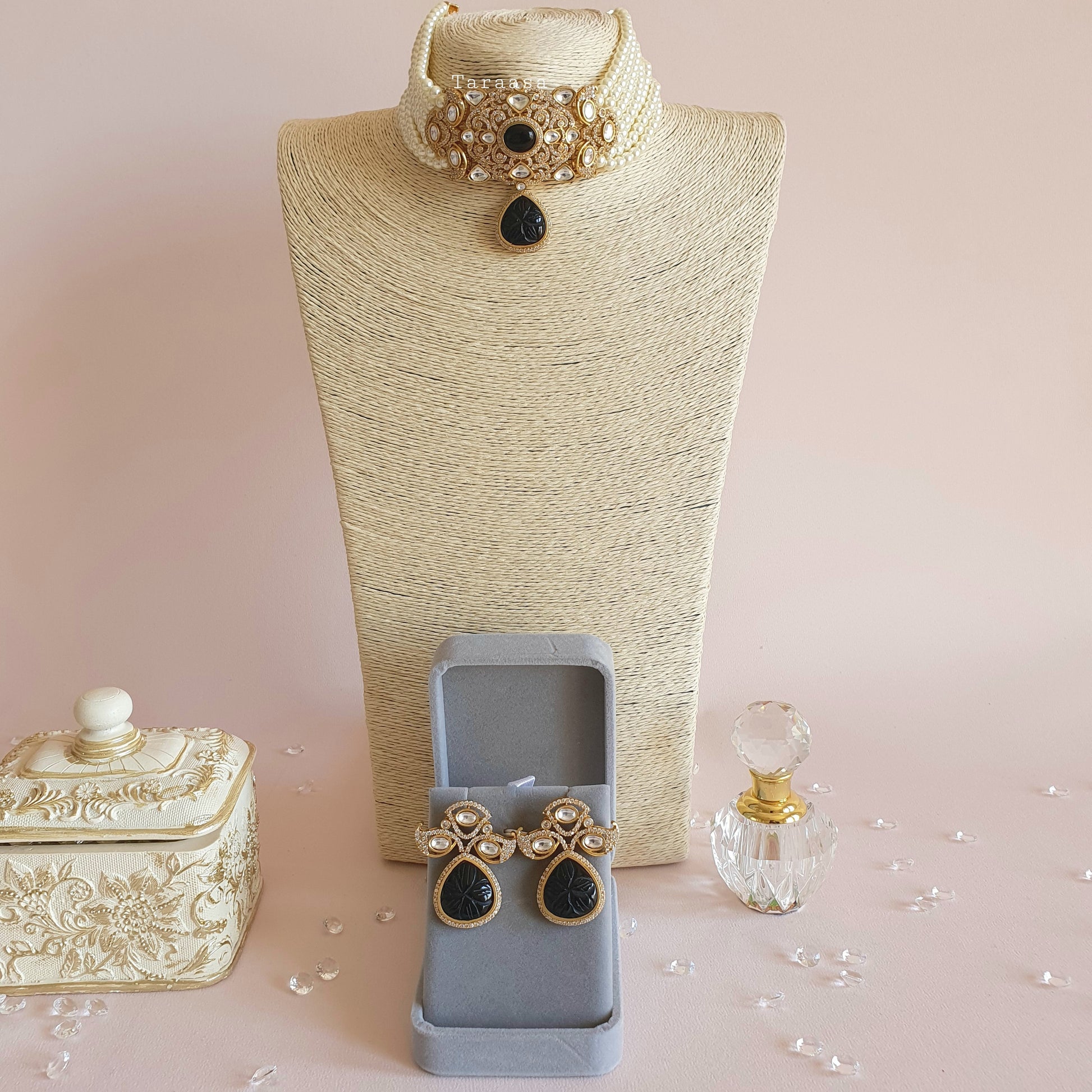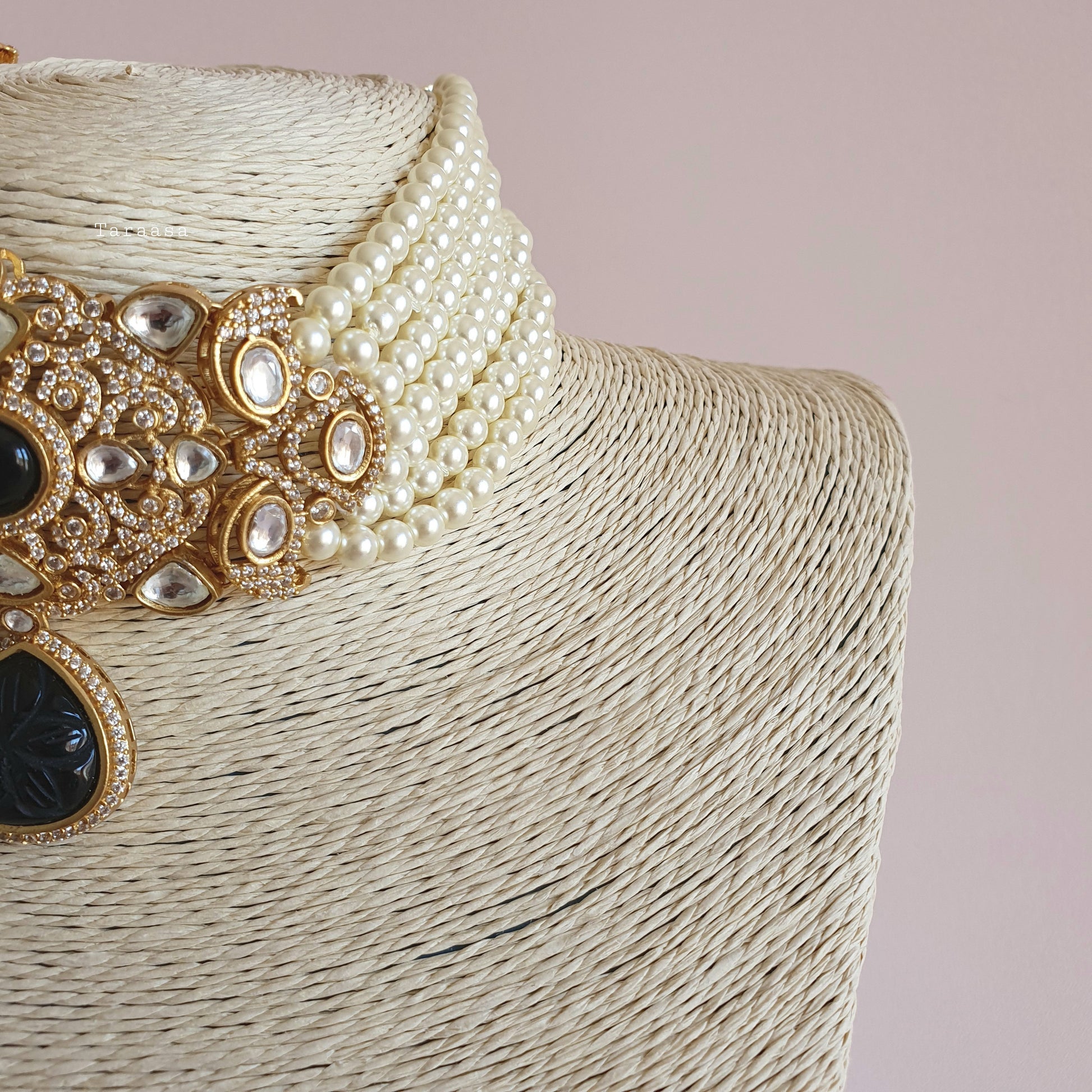 The timeless beauty of this set is sure to be treasured for years to come! Elegant rows of high quality pearls meet a hand carved, grey glass stone, surrounded by kundan stones . The matching earrings are an elegant moment of their own, which are irresistible to not wear over and over again.