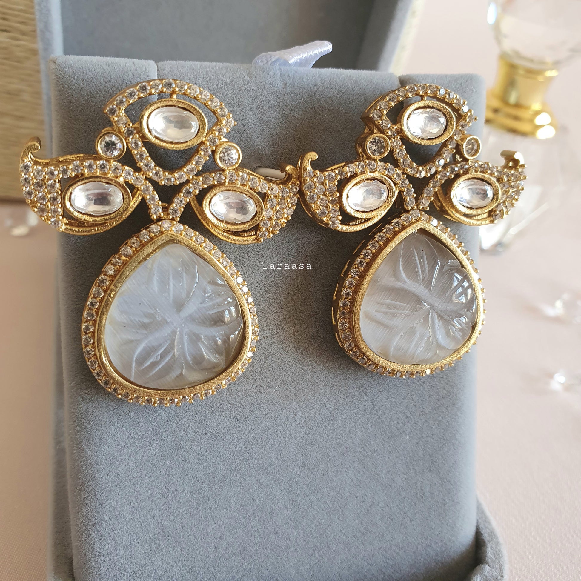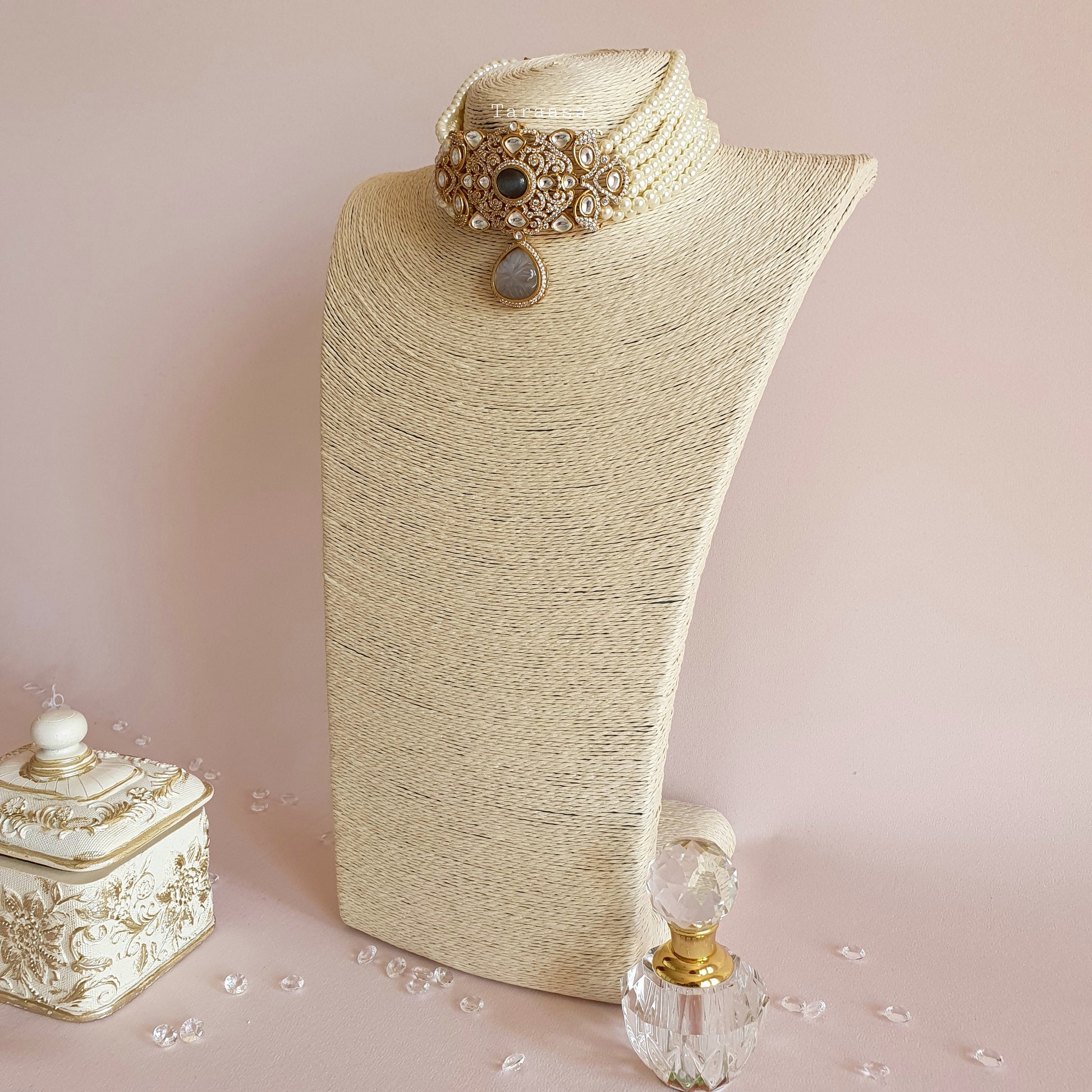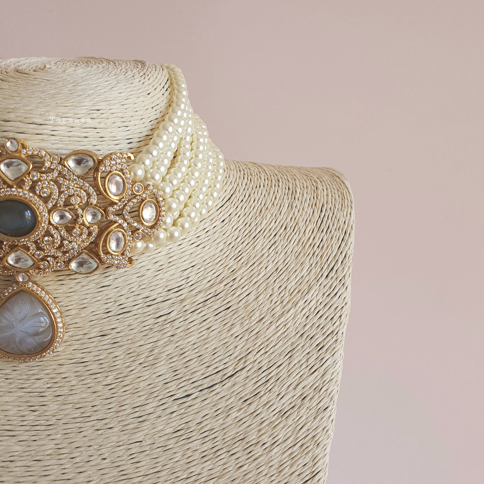 The timeless beauty of this set is sure to be treasured for years to come! Elegant rows of high quality pearls meet a hand carved, grey glass stone, surrounded by kundan stones . The matching earrings are an elegant moment of their own, which are irresistible to not wear over and over again.